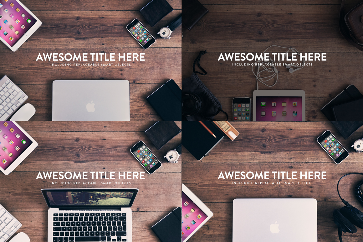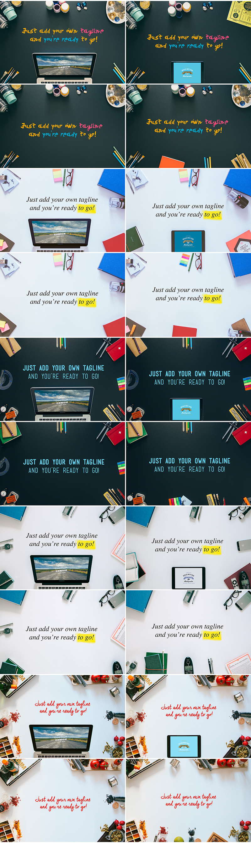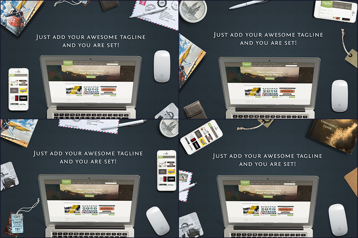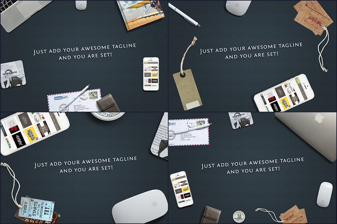 Use these hero/header presentation mock-ups from from mockupskingdom for your landing page, website header, presentation and more. Just add tagline and you are set! You can edit the Macbook, the magazine, the notebook, iPad, iPhone and the business cards. Have fun and be creative. Very easy to use. All scenes are 300DPI ready for print or you can downsize them for web. All Scenes are powered by Smart Object. All you have to do is to double click the layer “edit me”, place your design and save the smart object and your design renders in the scene. No Photoshop skills required.
