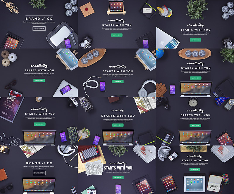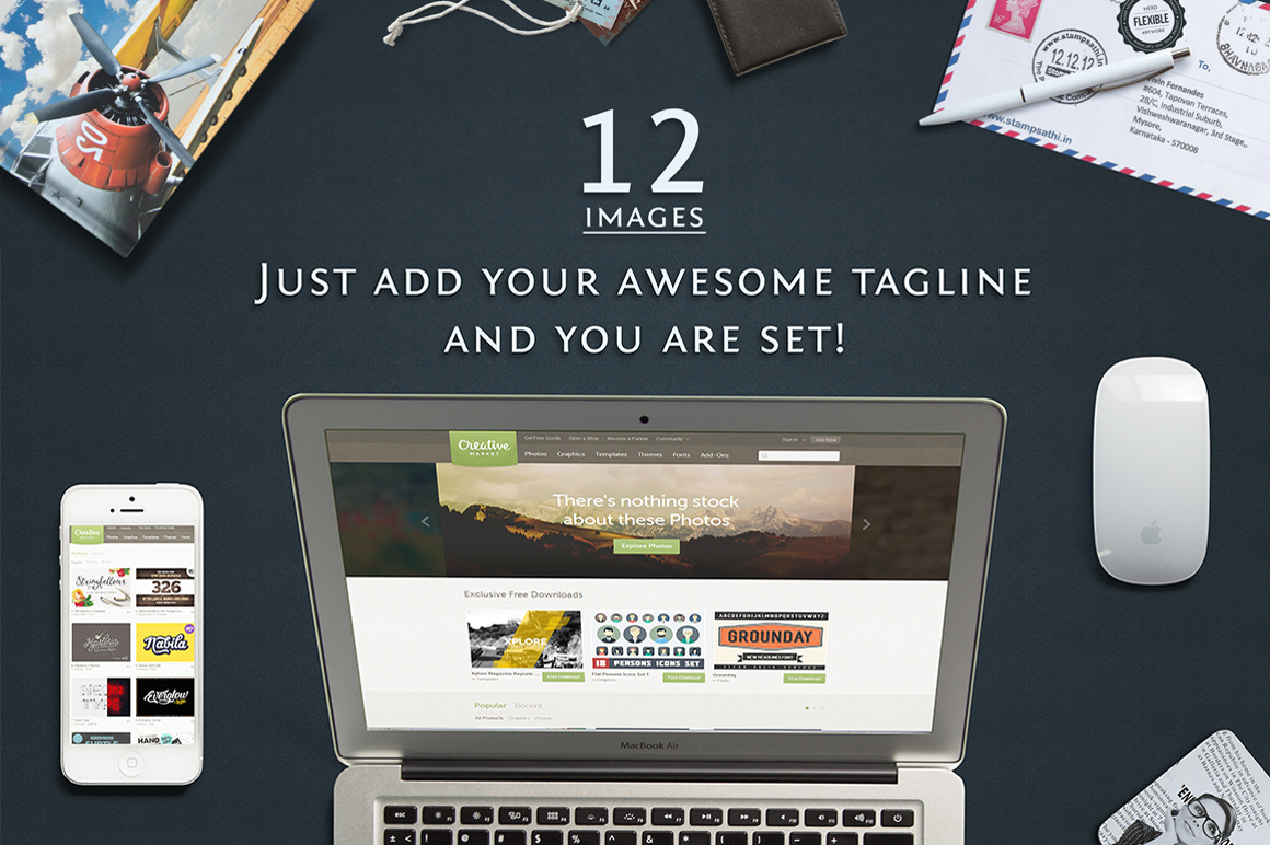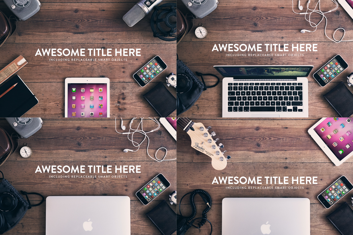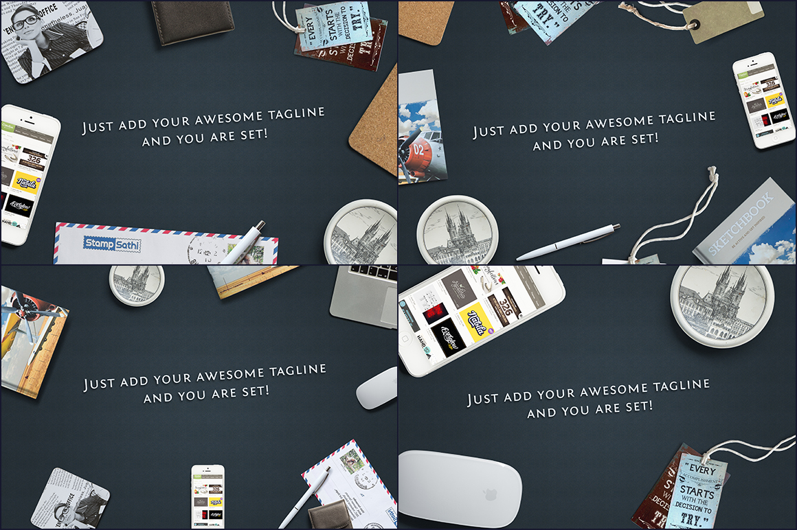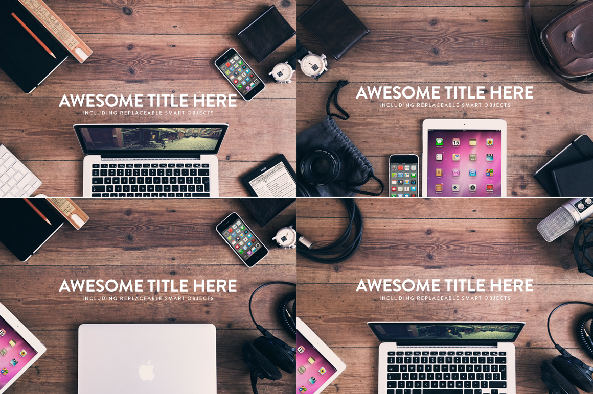 Use these hero/header presentation mock-ups from from mockupskingdom for your landing page, website header, presentation and more. Just add tagline and you are set! You can edit the Macbook, the magazine, the notebook, iPad, iPhone and the business cards. Have fun and be creative. Very easy to use. All scenes are 300DPI ready for print or you can downsize them for web. All Scenes are powered by Smart Object. All you have to do is to double click the layer “edit me”, place your design and save the smart object and your design renders in the scene. No Photoshop skills required.