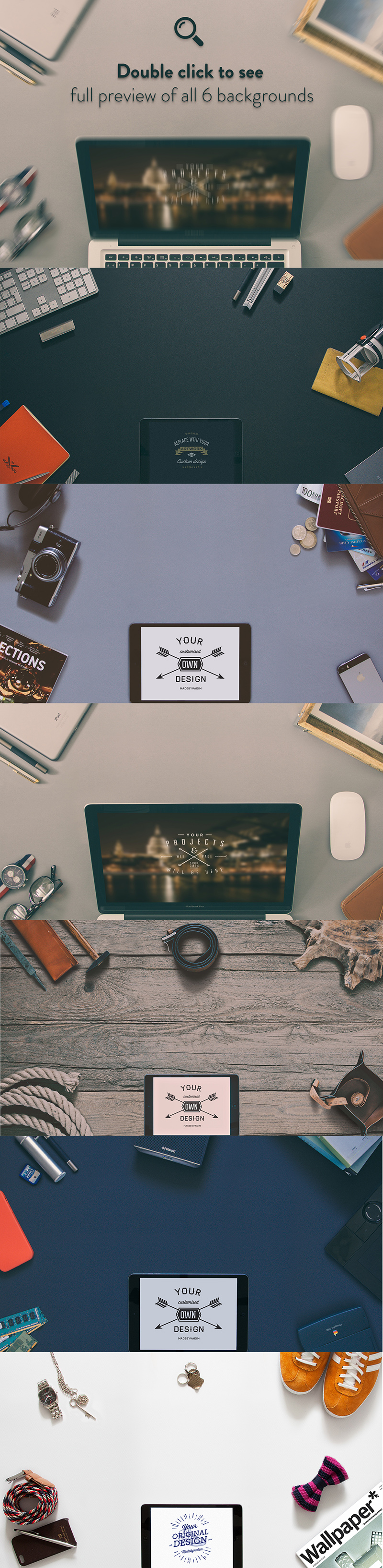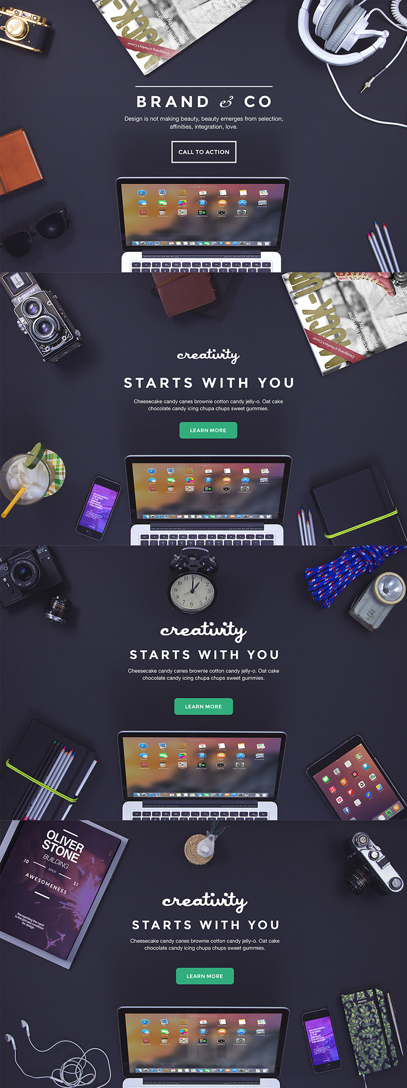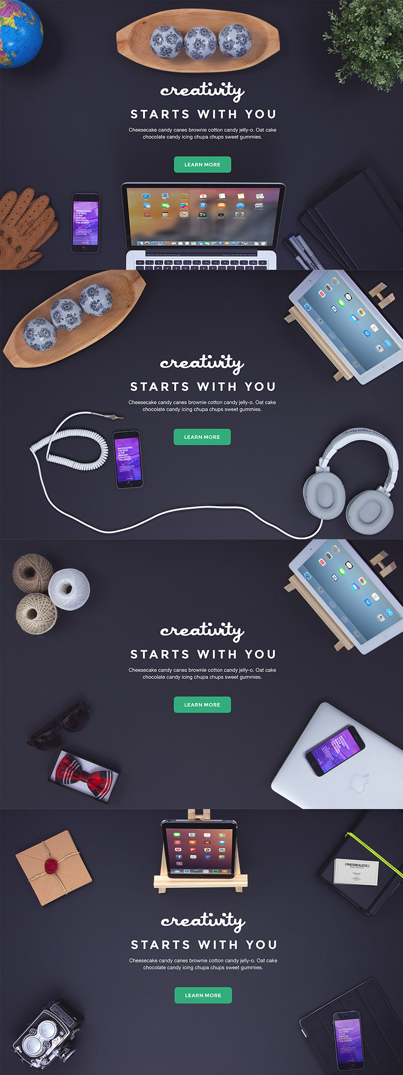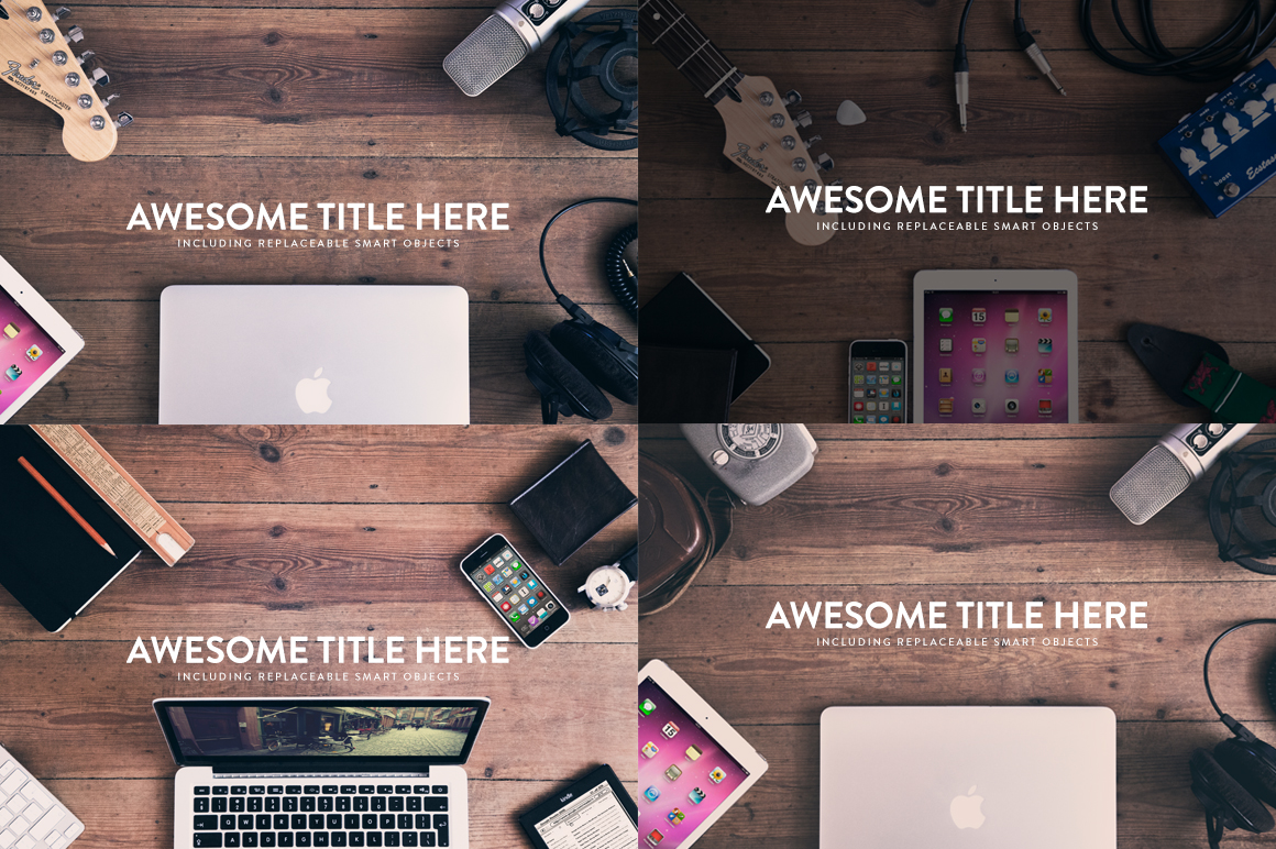 Use these hero/header presentation mock-ups from from mockupskingdom for your landing page, website header, presentation and more. Just add tagline and you are set! You can edit the Macbook, the magazine, the notebook, iPad, iPhone and the business cards. Have fun and be creative. Very easy to use. All scenes are 300DPI ready for print or you can downsize them for web. All Scenes are powered by Smart Object. All you have to do is to double click the layer “edit me”, place your design and save the smart object and your design renders in the scene. No Photoshop skills required.