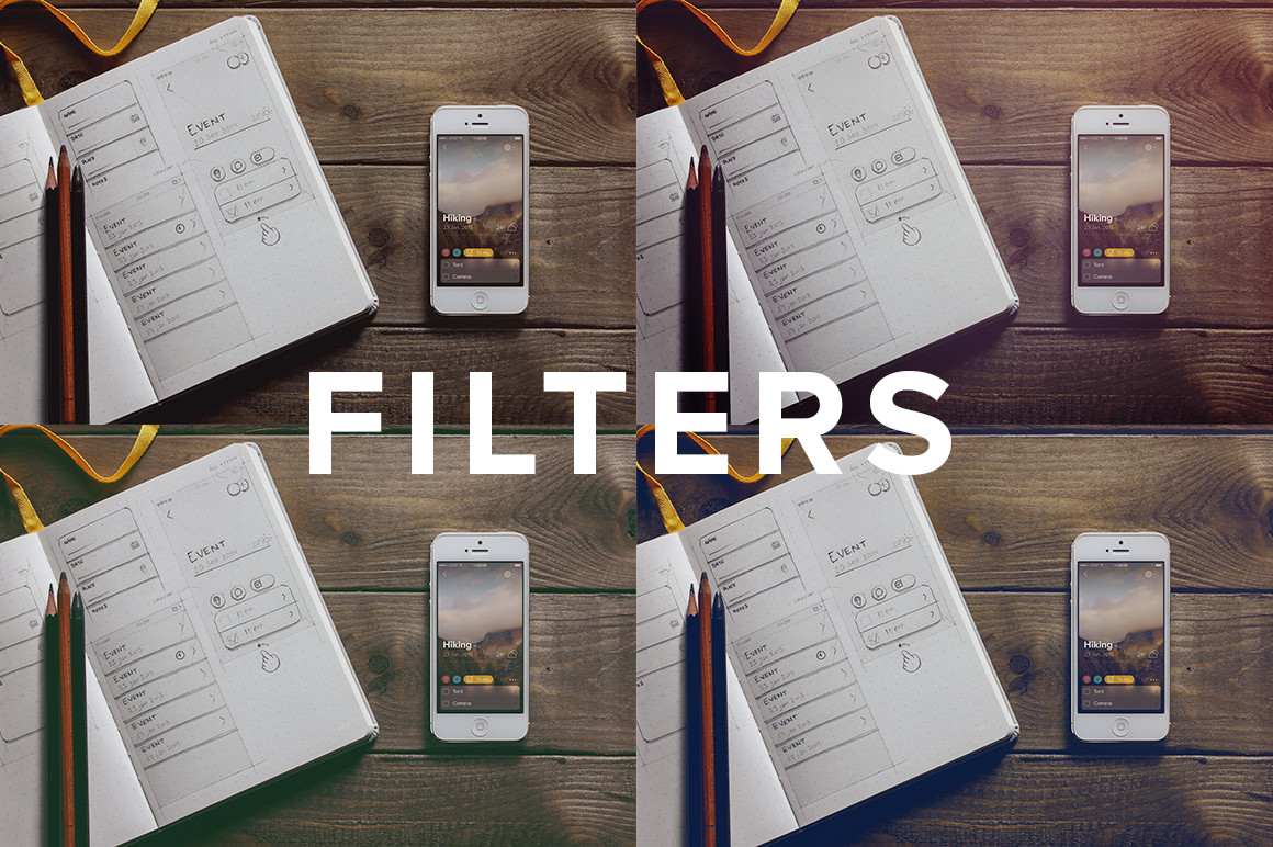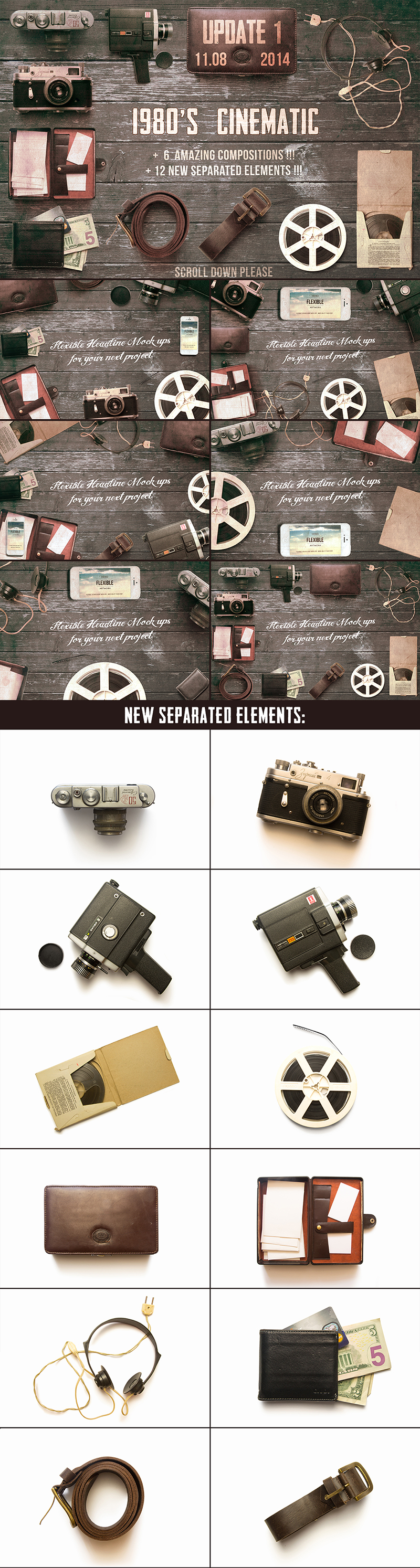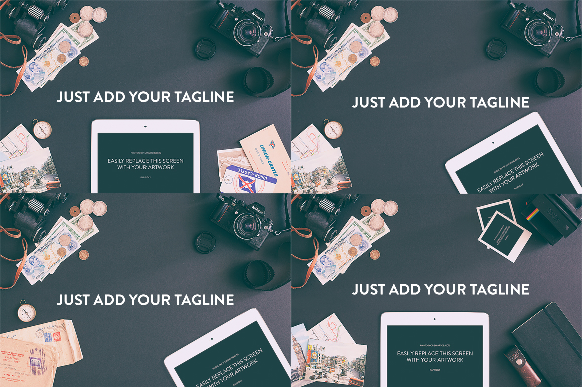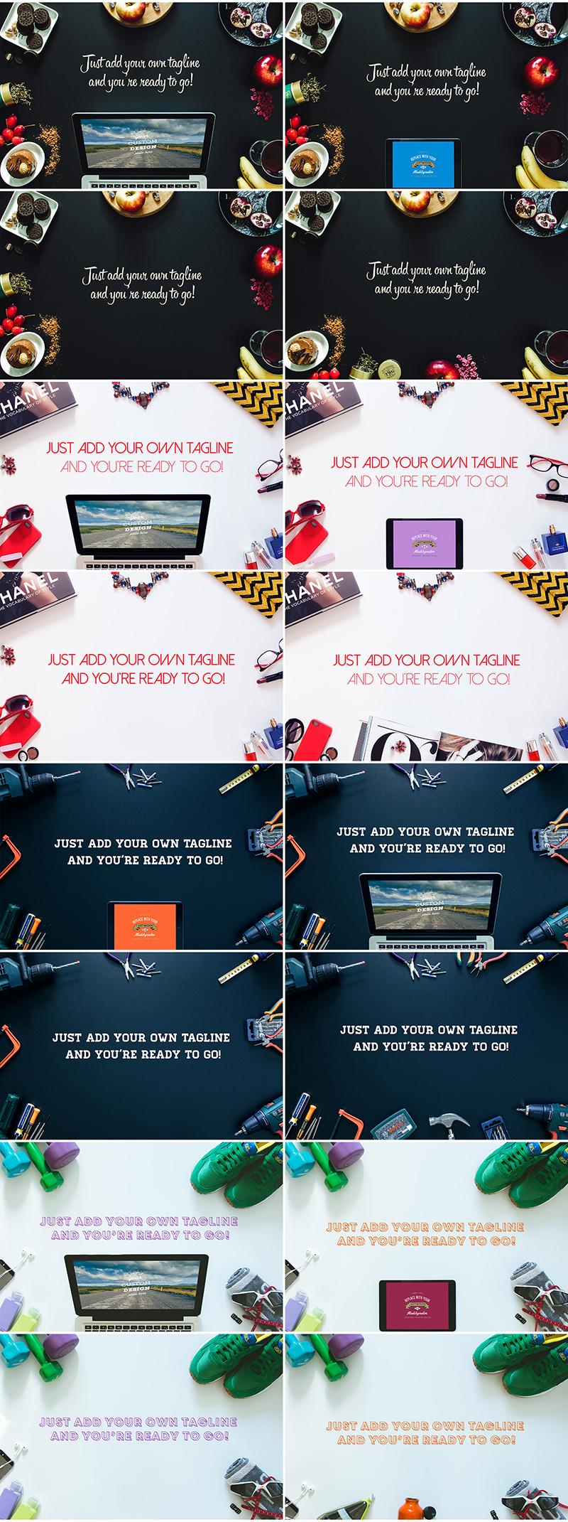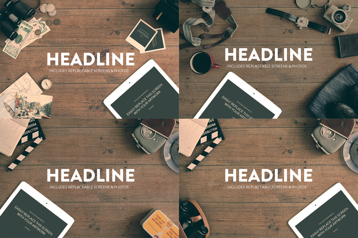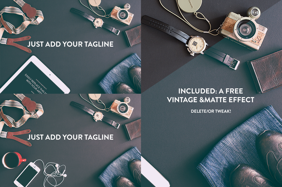 All elements are separated and can be modified (mock-uped, move, scale, rotate, hide, unhide, create your own composition). The size of compositions is 4500 x 3000px and based on real professional photos for each object. Elements file: each element is too large (4500 x 3000) that you can present your design on each of them individually by using smart objects. 18 ready to use Tagline/Headline compositions (with Update №1). Ready filters by one click for each of styles. Changeable Background.