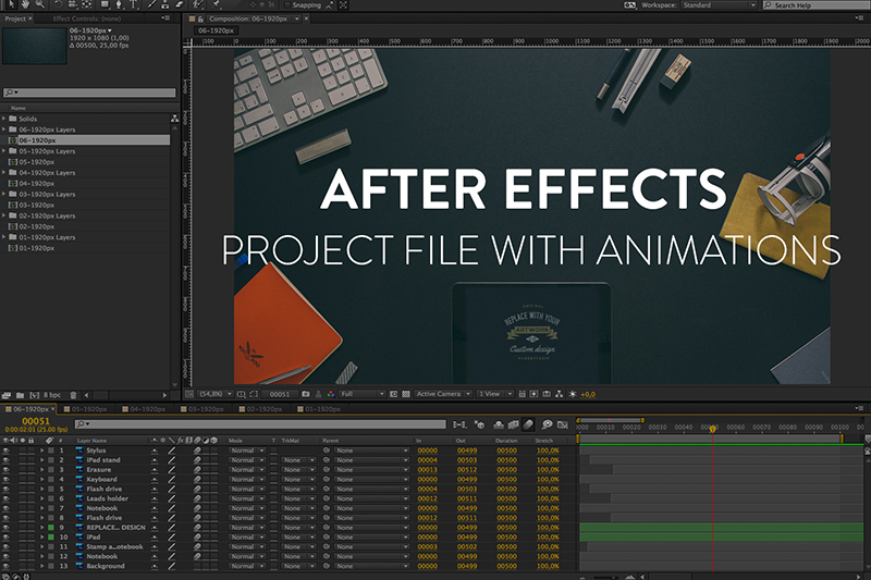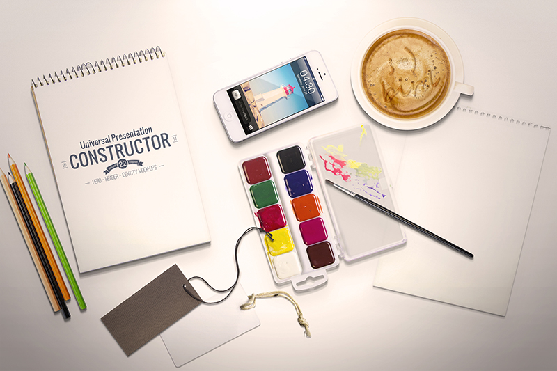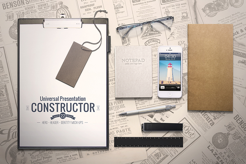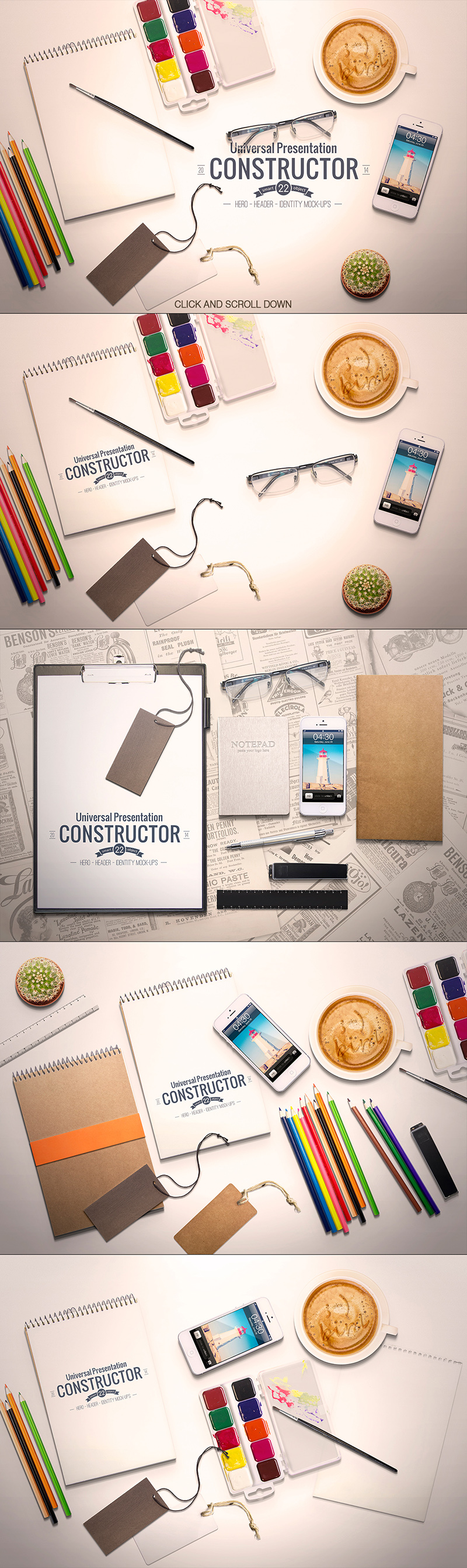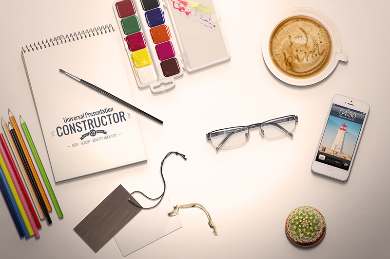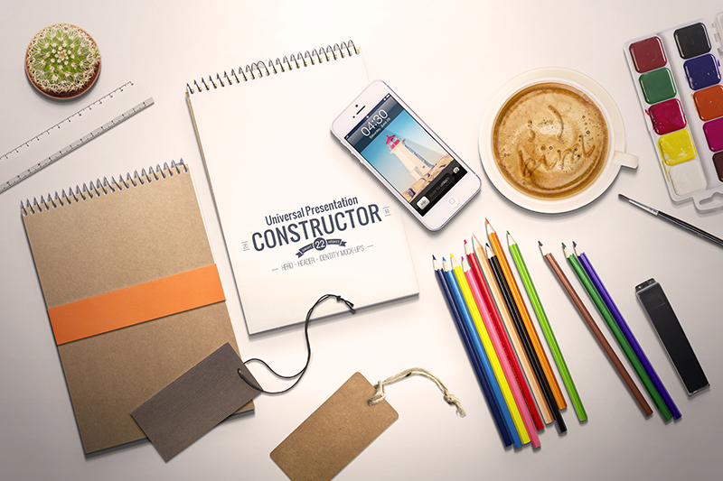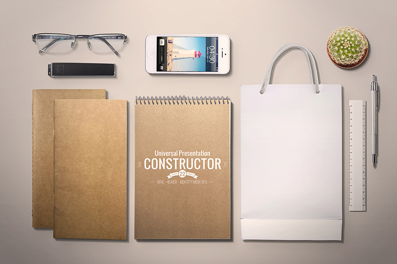 Universal Constructor can be used as an *identity mock-up*, *landing pages project*, *website header presentation* etc, everything you can imagine!!! All objects in this templates are split into separated folders. So feel free with changing the size, positions, rotations, hide / unhide the objects. Each object has it’s individual shadow that will change direction depending on it’s own rotation. Also because this composition is using Global Lighting, it’s easy to change the direction of the light of the whole composition. Add your own design to the objects by using smart-objects in simple and easy way.