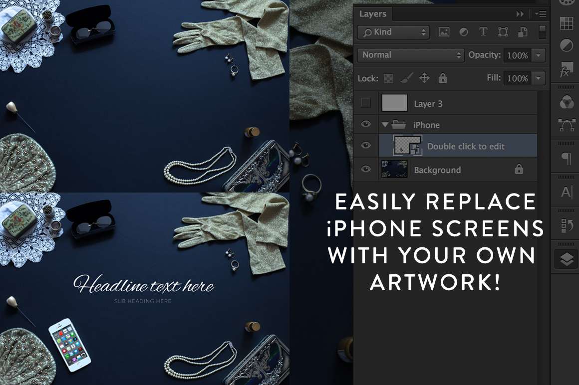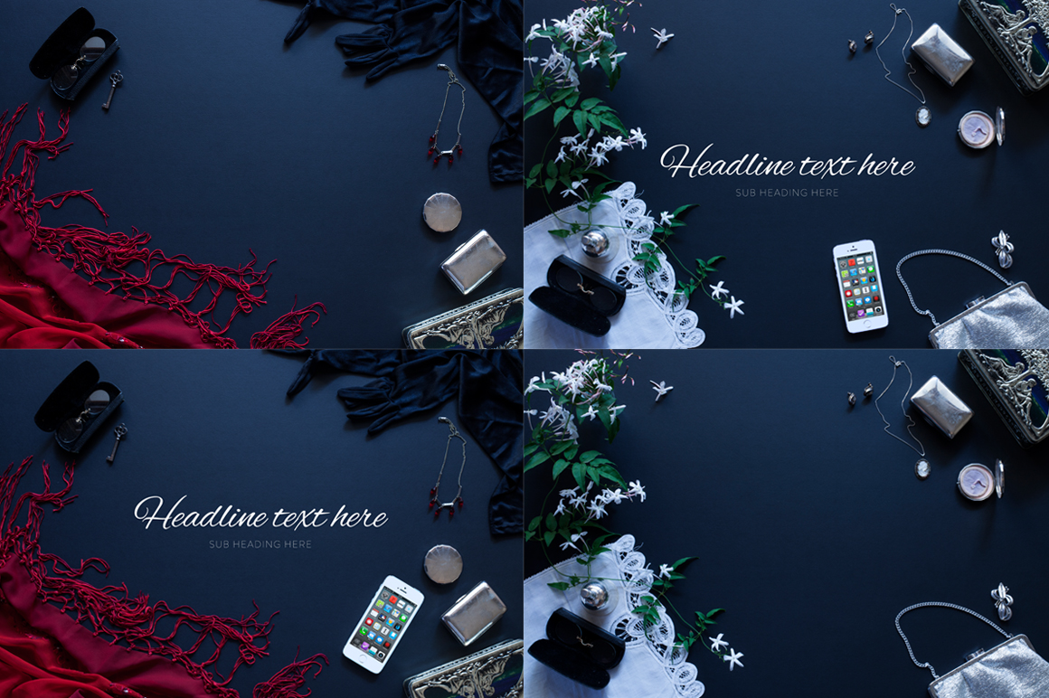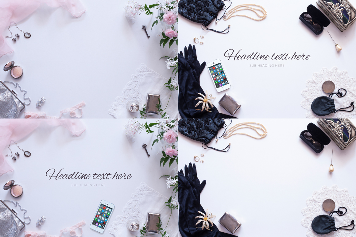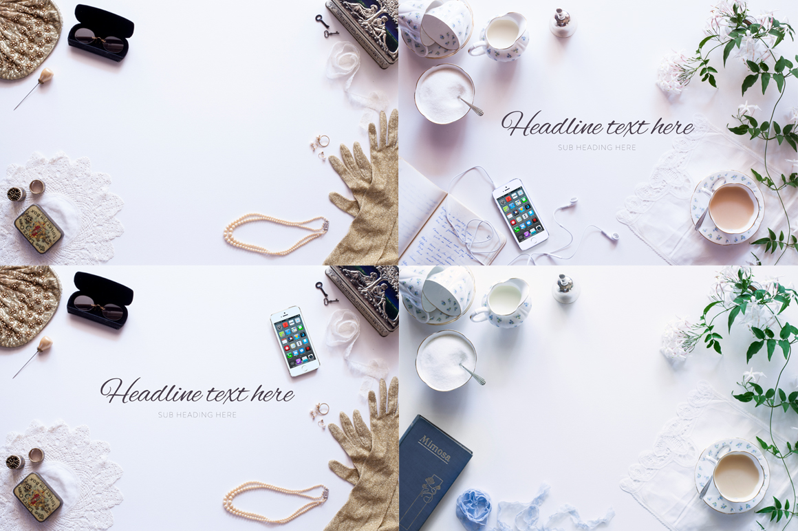 The latest in our Hero Images series – 14 Feminine Vintage images for you to use for your next landing page, header/hero image, presentations or print design project! The series includes both light and dark backgrounds as well as an arrangement with and without an iPhone 5s – giving you the versatility you need to use them however you need. The screen of the iPhone is a Photoshop smart object – allowing you to easily replace the contents with your own design or app screens.