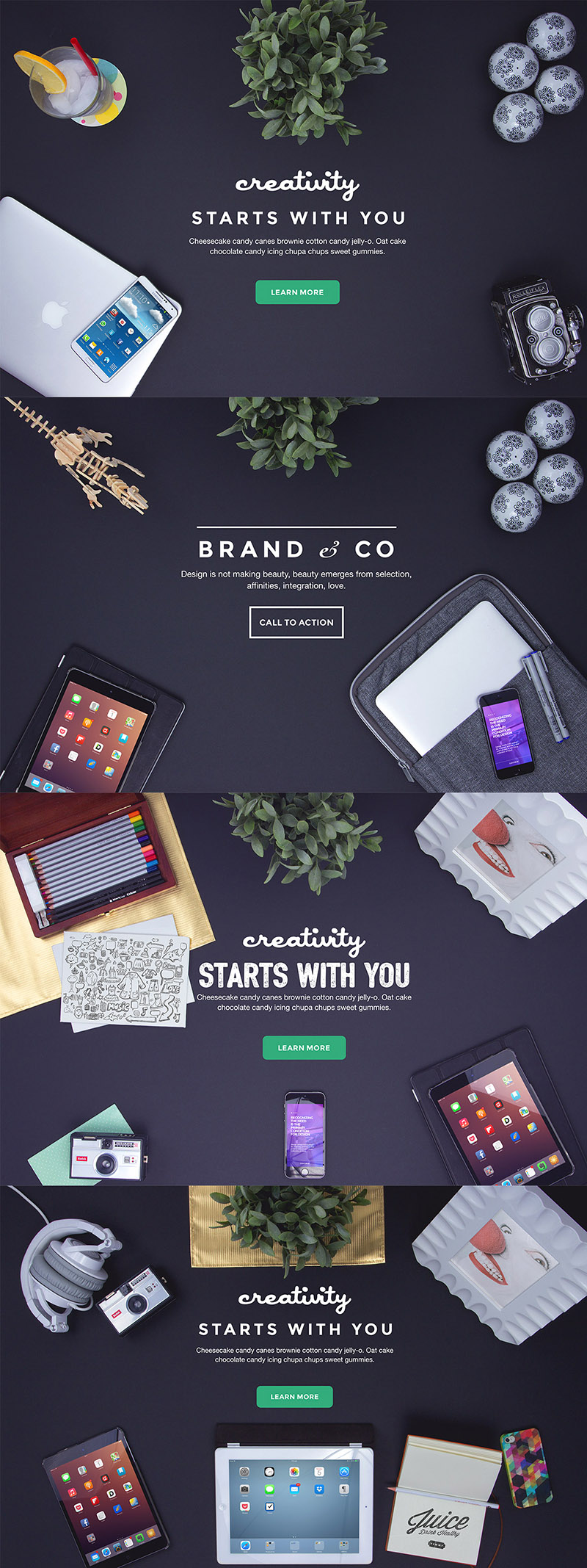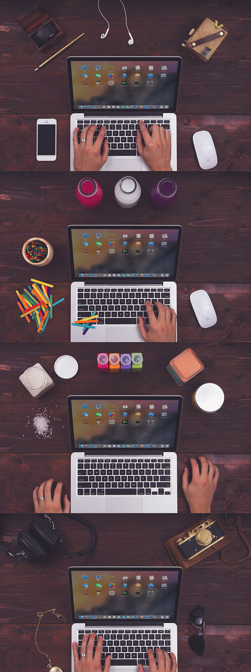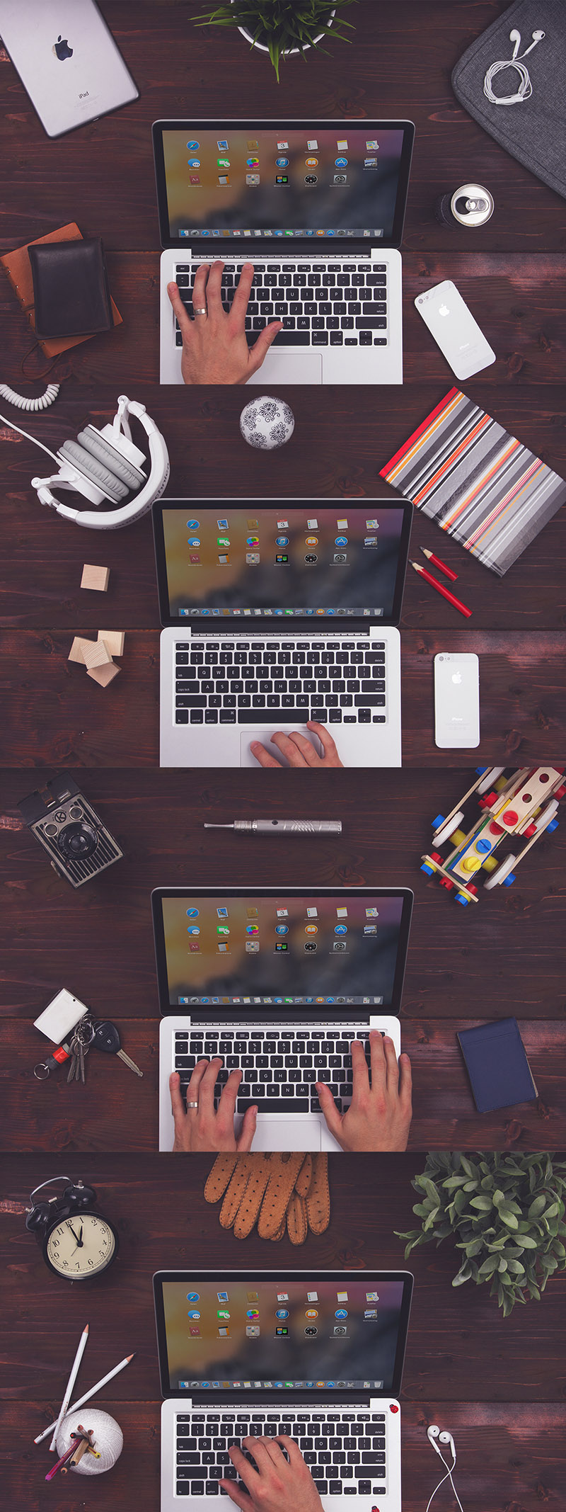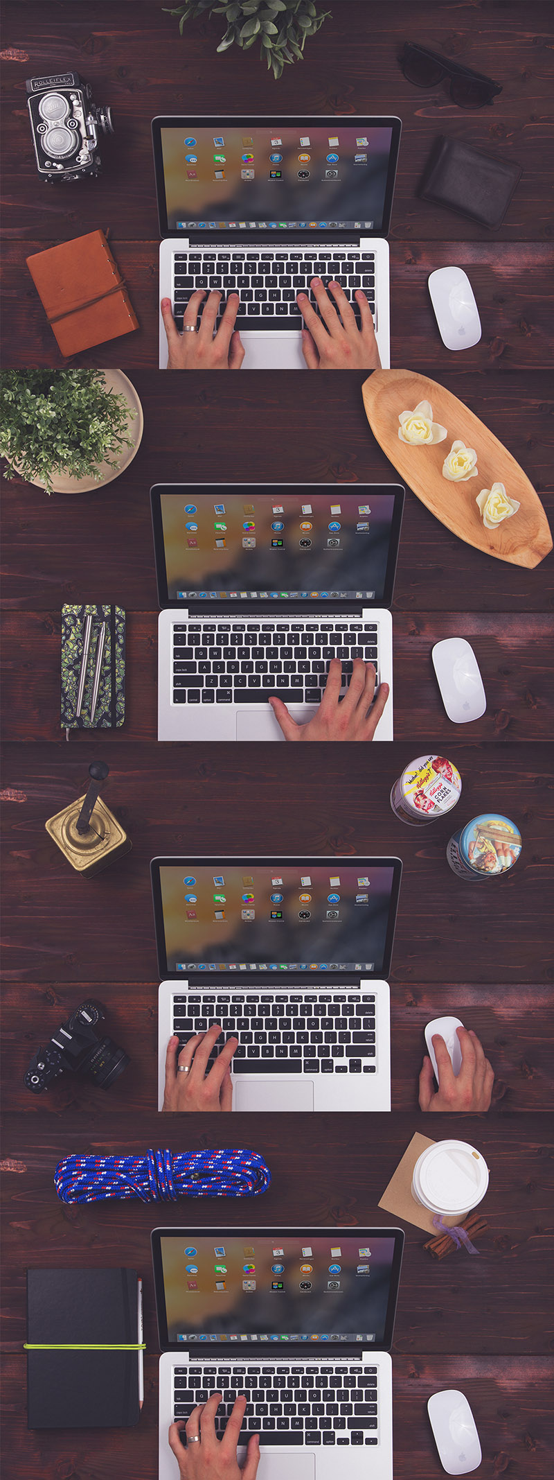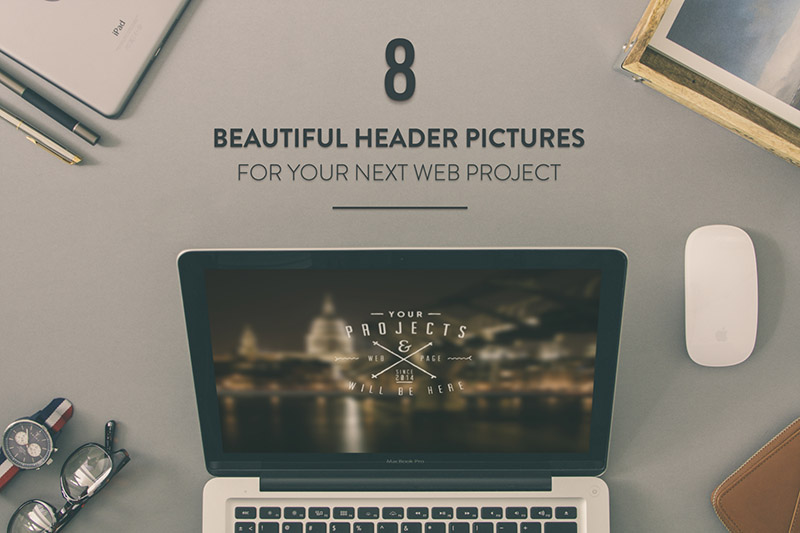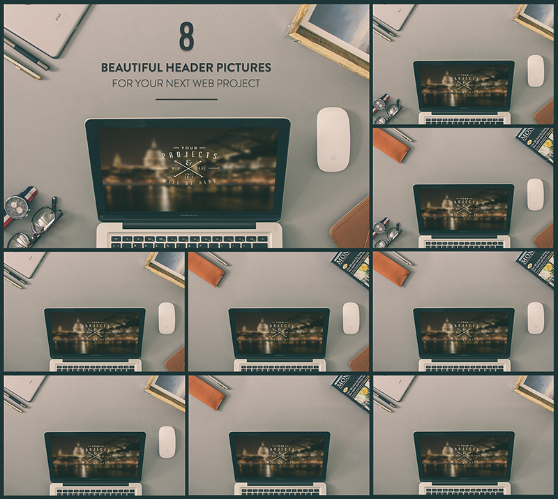 Beautiful “header”/hero images pictures for you next BIG web project with replaceable Smart Object screen for Mac Book Pro centerpiece. 8 Pictures to choose from. From 10 objects ( including main Mac Book pro replaceable screen centerpiece) to “basic” 5 object picture. 2 variation for top objects.