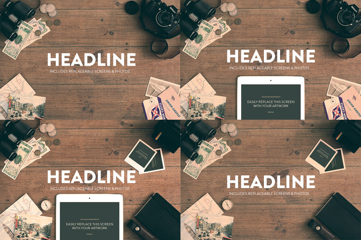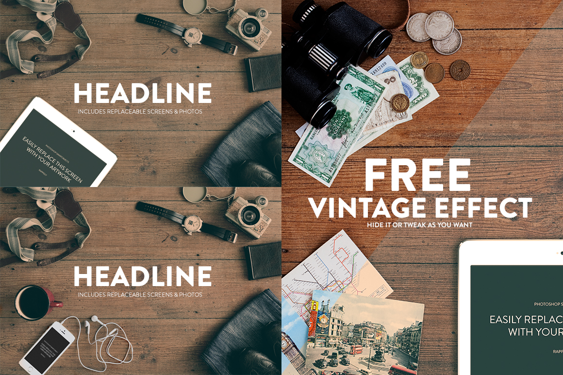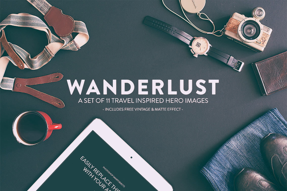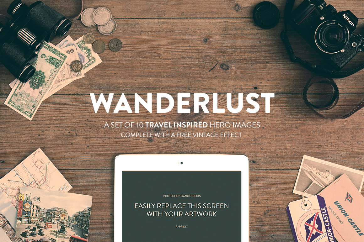 The latest in our header/hero image series – this a travel inspired range featuring a wood background and a free vintage effect. In the pack you get 10 travel inspired images to use as large full width images on your website, create landing/coming soon pages or even use them for print/magazine design work. All the digital devices used in the photos (iPhone and iPad) have replaceable Smart Object ‘screens’ making it easy for you to drop in your own designs or images. The polaroid images are also smart objects and you can replace with your own photographs. The vintage effect is applied in a separate layer above the background and can be turned off if you do not want the effect or tweaked to achieve your desired result. Image sizes: 5561x3718px and saved at 300dpi.