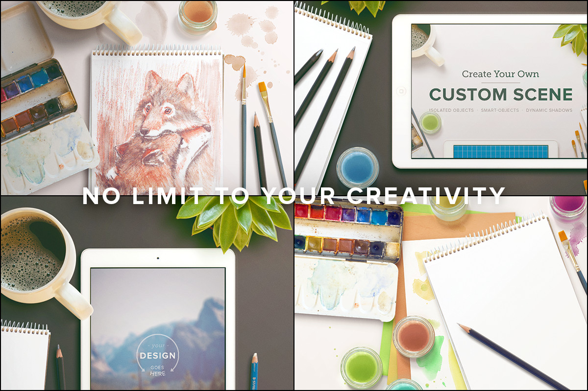Use these presentation mock-ups for your landing page, website header, presentation and more. Just add tagline and you are set! You can edit the iPad, text and more. Have fun and good appetite. Very easy to use 12 organized PSD’s. All scenes are 300DPI ready for print or you can downsize them for web. All Scenes are powered by Smart Object. All you have to do is to double click the layer “edit me”, place your design and save the smart object and your design renders in the scene. No Photoshop skills required.