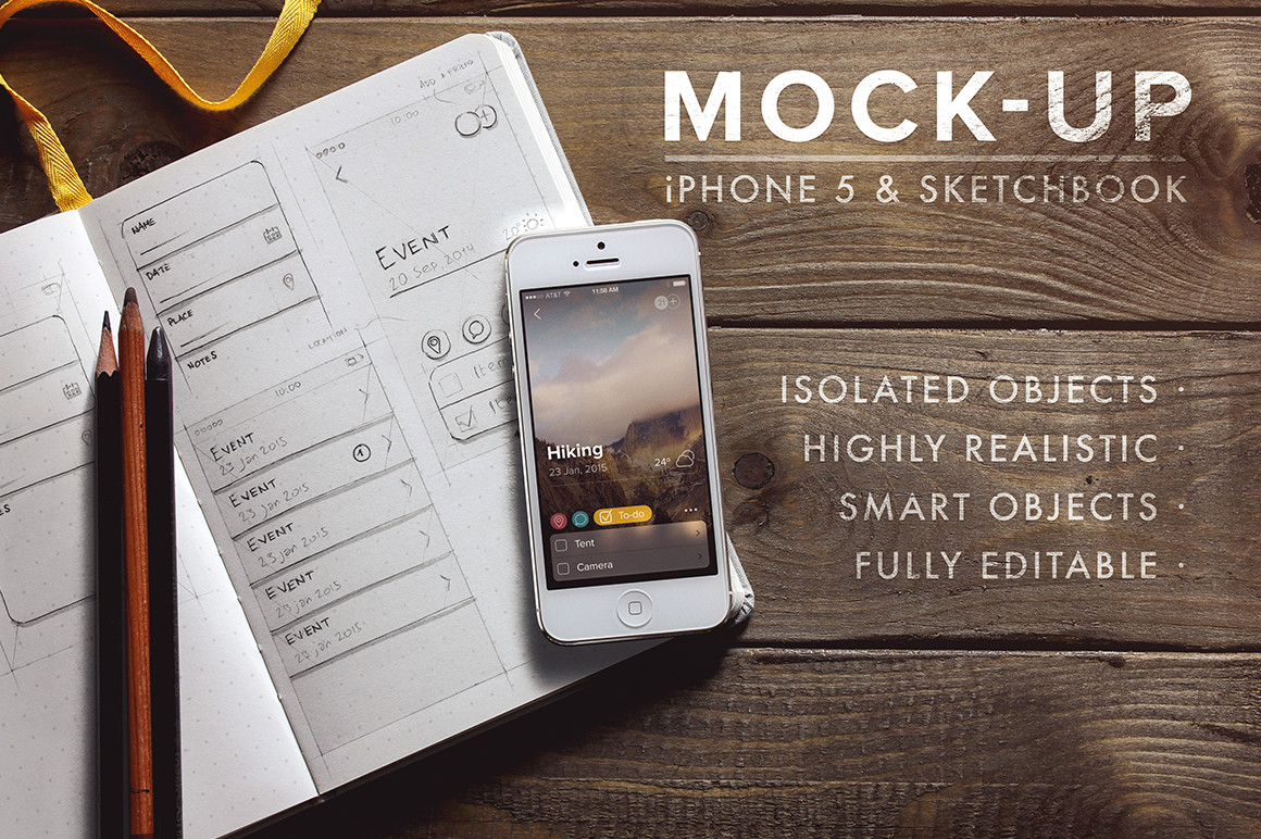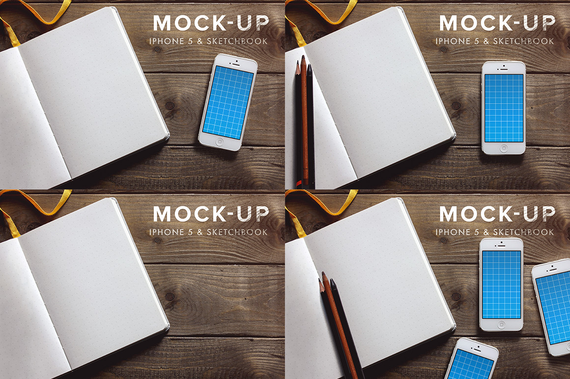 Mock-up with iPhone 5, Sketchbook and Copy Text made of real photographs. This PSD includes isolated objects (iPhone & Pencils) to create unique compositions. It allows you to hide or duplicate objects, like having multiple iPhones! The sketchbook is also editable with left and right page. In each page a dot-grid layer is included, perfect for your wireframes and technical drawings!