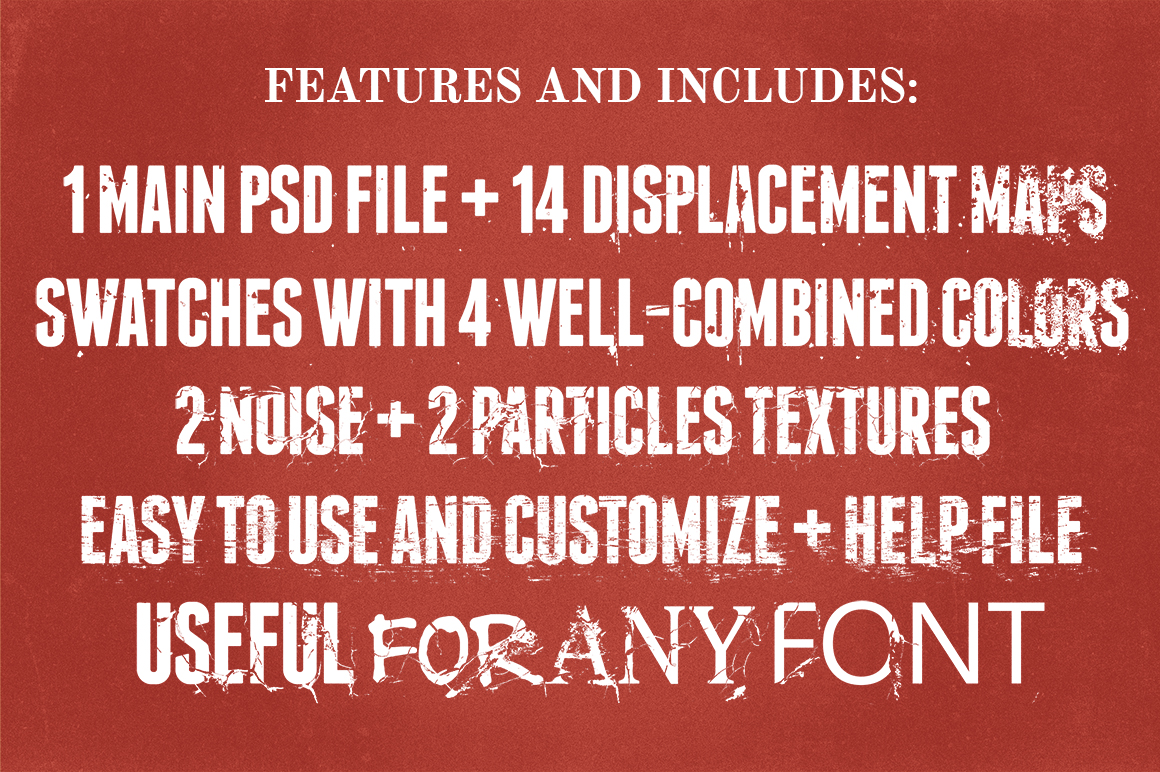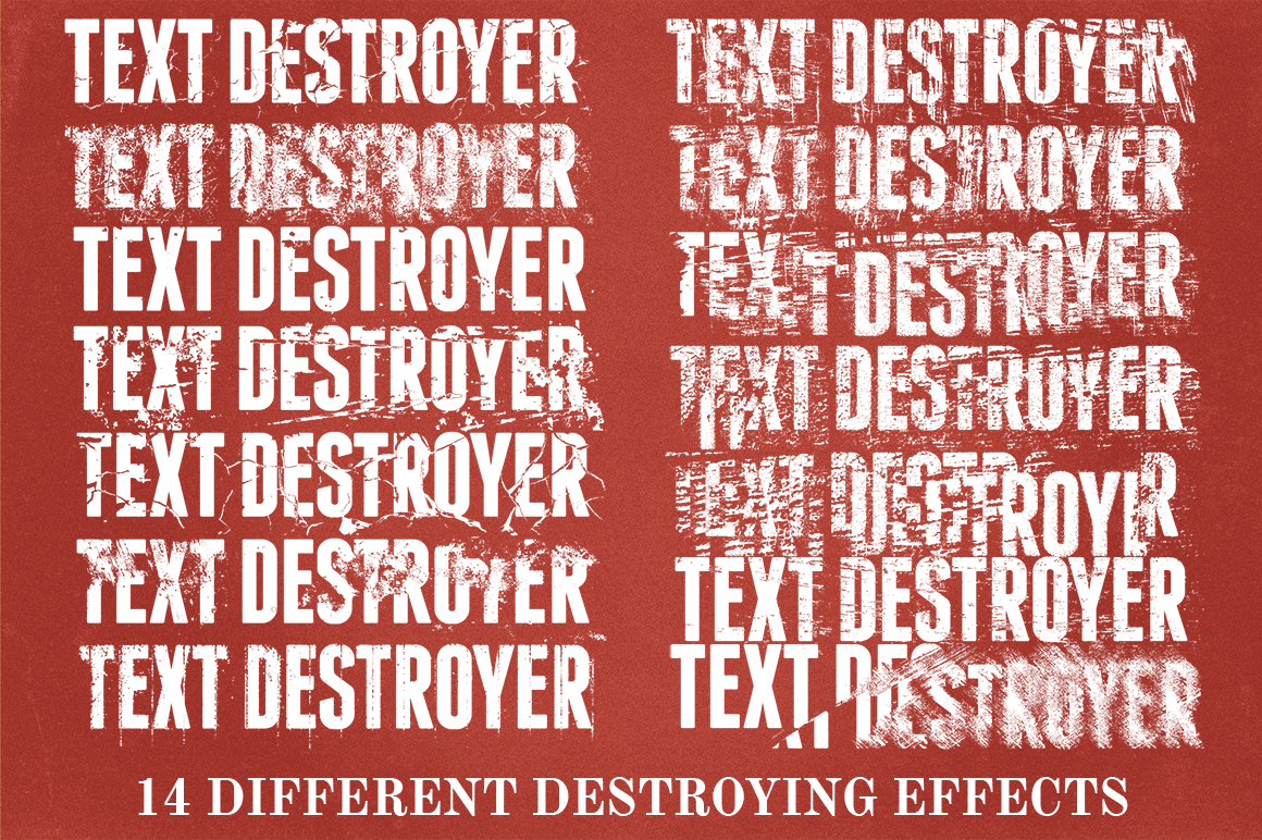 Do you like grunge or vintage design? And what about glitch and noise? So, why you still don’t have “Text destroyer”? “Text Destroyer is a very original item, doesn’t follow trends, it has its own style and gives a unique effect to text layers. Now, if you add this originality to the fact that you can change the settings each time you apply the effect, and that there are 14 initial different effects, you can practically say that the variations are endless. Pretty straight forward to use and easy to combine with any other effect and design to achieve and awesome result.”