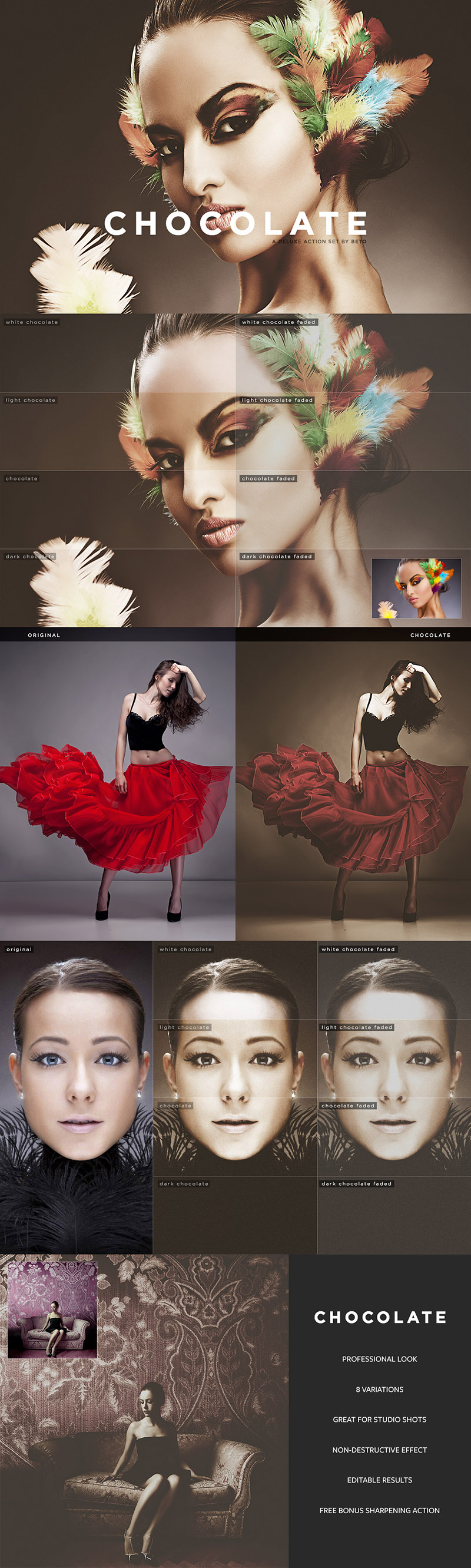 Chocolate is a set of 8 Photoshop actions that give your images a retro/vintage Chocolate Look, it has 4 variations for a vintage washed/fade/crushed result.
