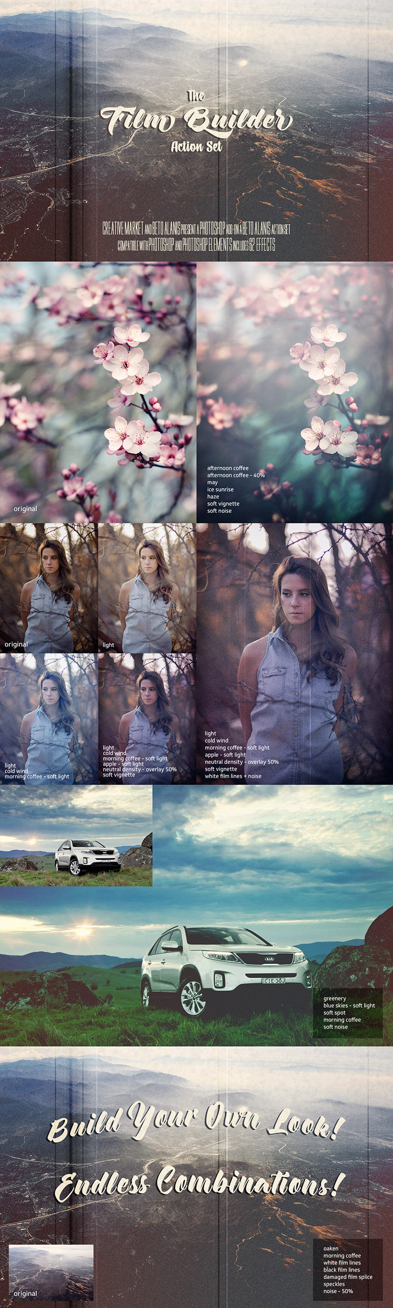 The Film Builder is a special “mix and match” Photoshop action set than includes 62 actions. Each one of the 62 actions are made to be combined with one another to produce infinite variations of film/cross processing/vintage photography. In the preview images you can see specific combinations of some of these actions, change the order of the actions, and you get a different look, change the opacity or the blending mode, and build your own vintage film look. The action set includes actions to change the tone of the images, to give special vintage effects (film lines, noise and vignettes) and 2 special combinations for a unique look.