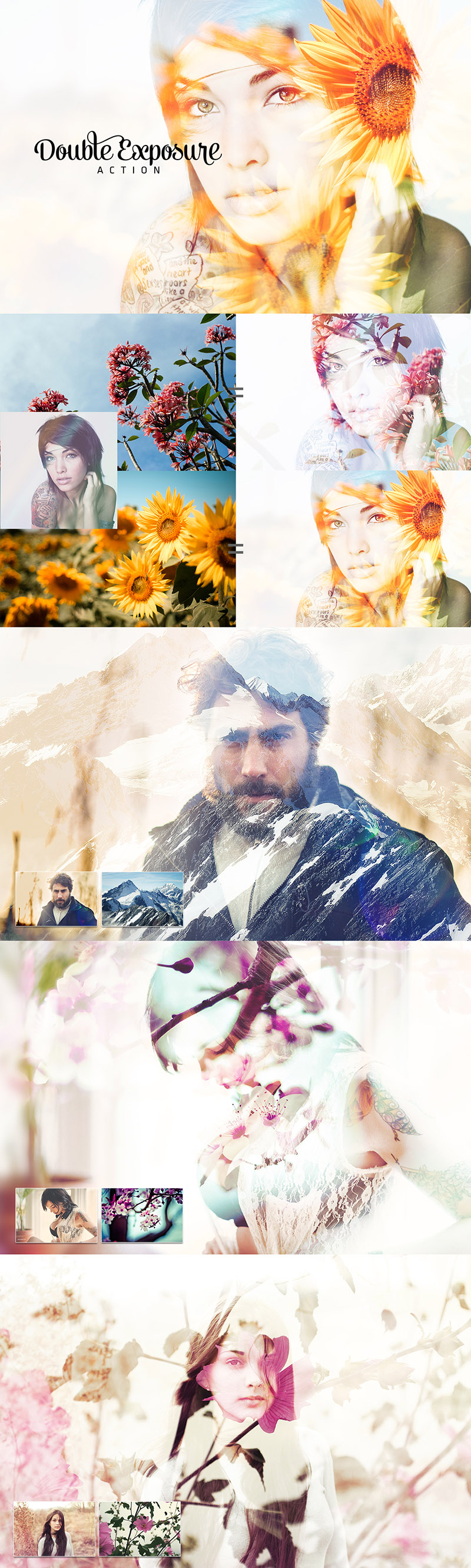 Set of 4 Photoshop actions to simulate a Double Exposure Effect. It can be combined with any other actions as it doesn’t modify the color.