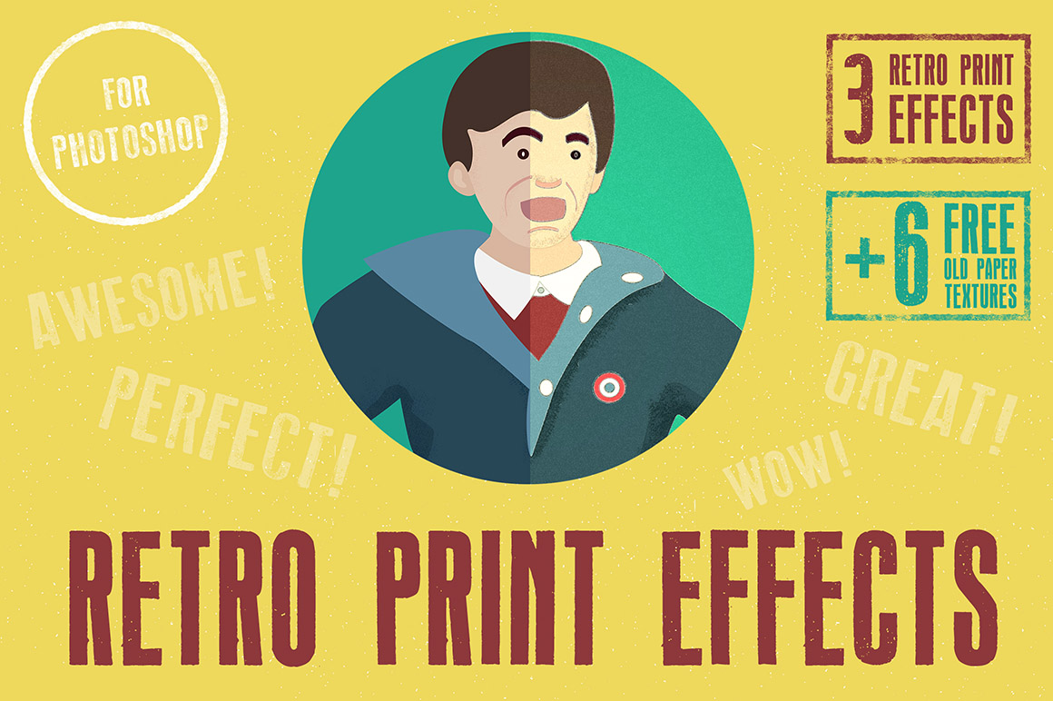 Dear friends, I am proud to announce to you, that I recently made these 3 perfect retro-looking print effects for Photoshop! My inspiration was based on first illustrations printed in colors, so I tried to create same effects in Photoshop. Here they are!