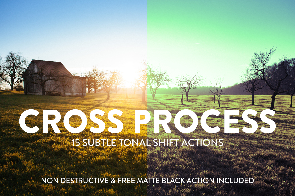 Get 15 Cross Processing actions and a free matte black action with our new Photoshop actions pack. These actions isolate your highlights and shadows allowing to independently apply colour effects/washes – creating unique and interesting cross processing effects. We have just included 15 of our favourites for this pack – but you could tweak and adjust them to create a whole lot more options to suit the style you are wanting to achieve. As with all our actions they are non destructive – using layer adjustments styles – and everything is neatly grouped into a new labelled folder.
