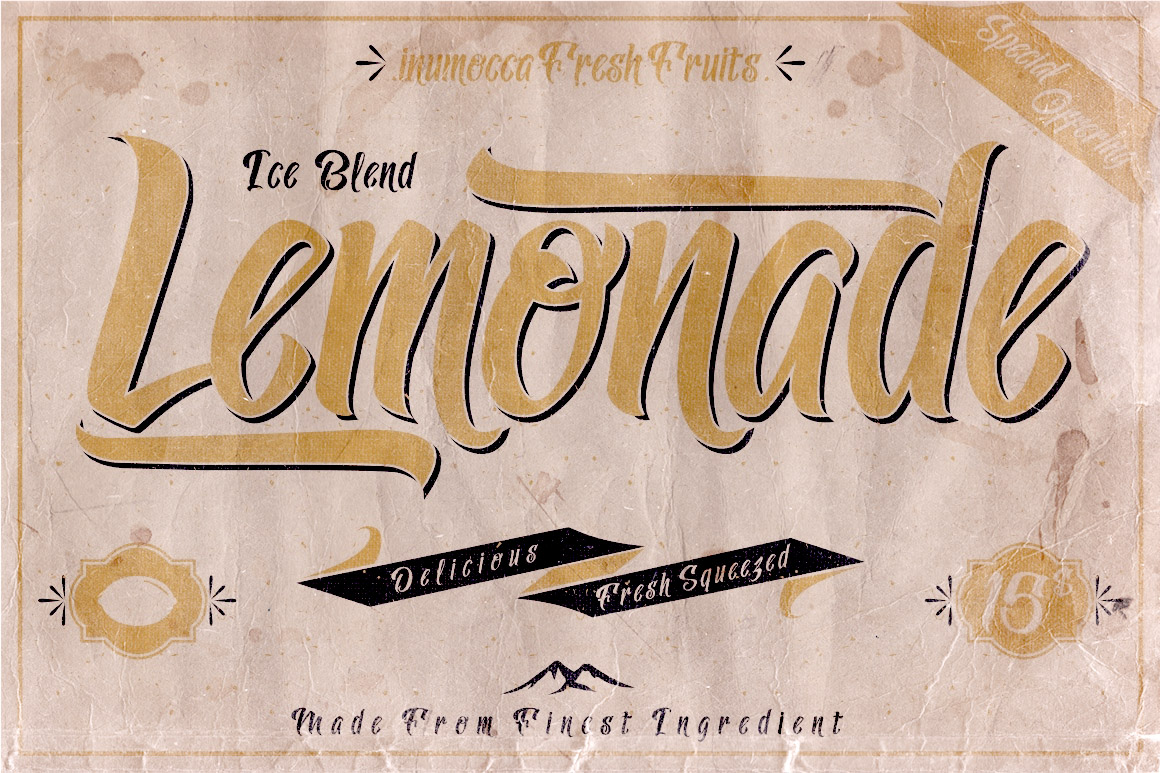 Lemonade font inspired from vintage style of packaging. Its really great font for your band, company, label, clothing company, vintage or classic stuff, etc.