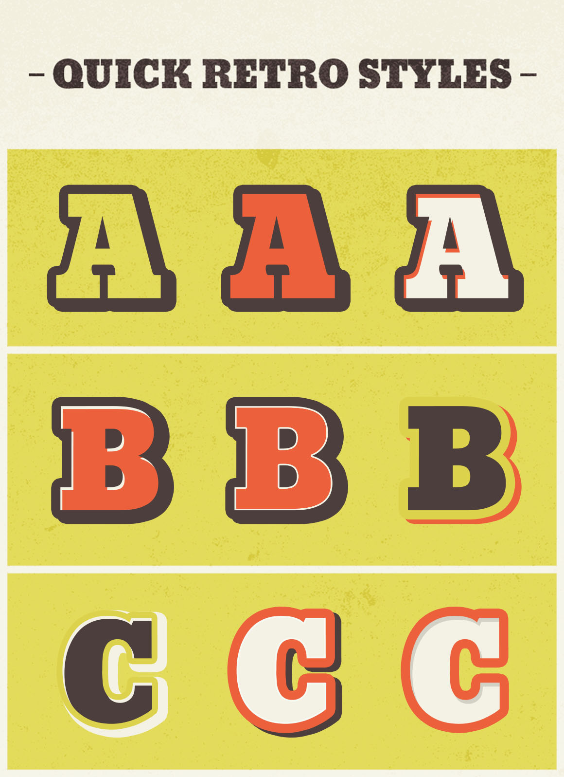 Cool & free Photoshop styles with retro or vintage effect for your shapes or texts from PixelMustache. Get a cool retro effect for your texts in seconds. More amazing freebies & items from this author here!
