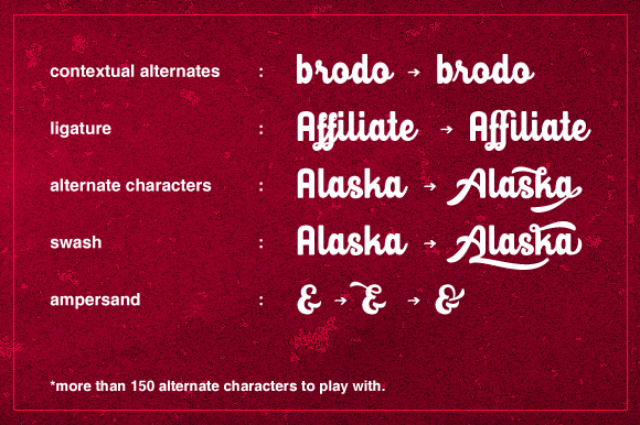 Baliho Script typeface is smooth, fun, and multi-purpose font. it can be used as a signage, poster, brand identity, advertising, etc. You will get this font in OpenType .otf format, so, make sure you use OpenType savvy program like Adobe Illustrator & InDesign then simply open Glyph Palette to access all of the glyphs. This font contains more than 150 alternate characters. Play with them and have fun!