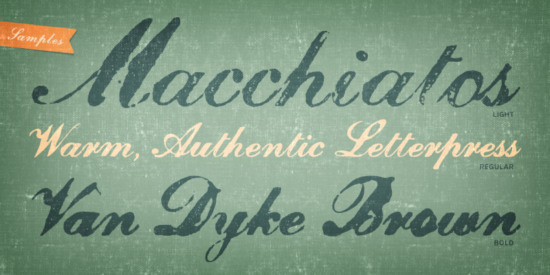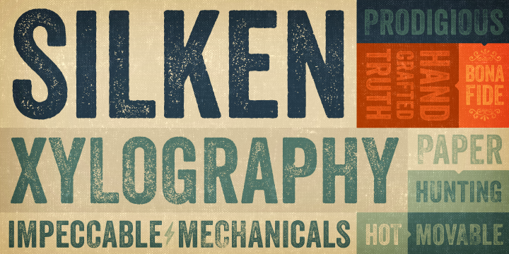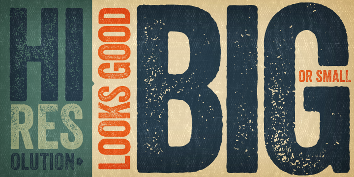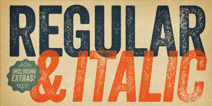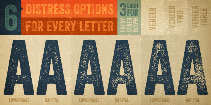 Veneer from Yellow Design Studio is a high resolution hand-crafted letterpress font that’s vintage and authentic with a touch of grunge. It’s highly customizable with six distress options for every letter and three for all other characters, and because it’s remarkably detailed, it looks great even at very large sizes. In addition it includes a matching set of funky extras!