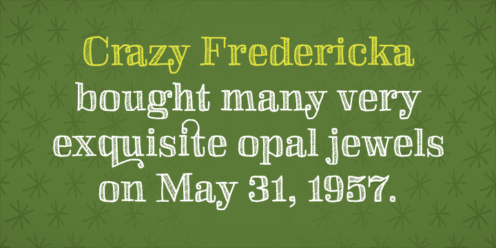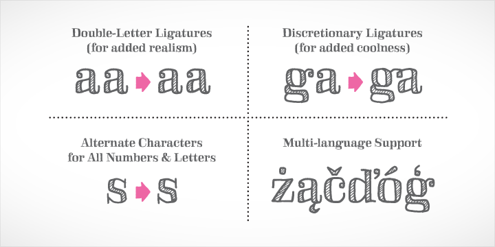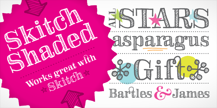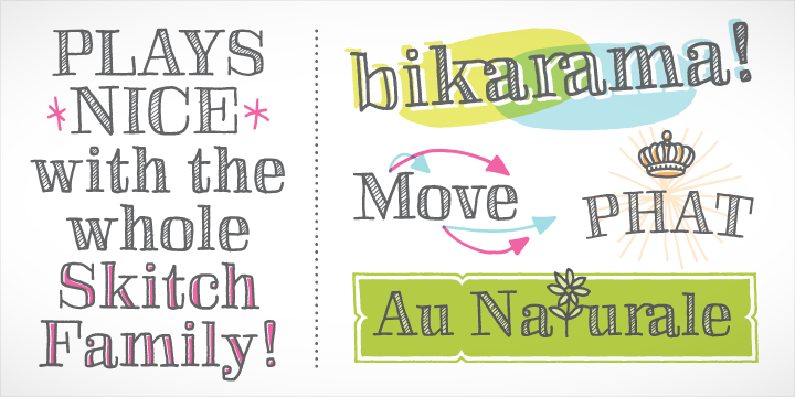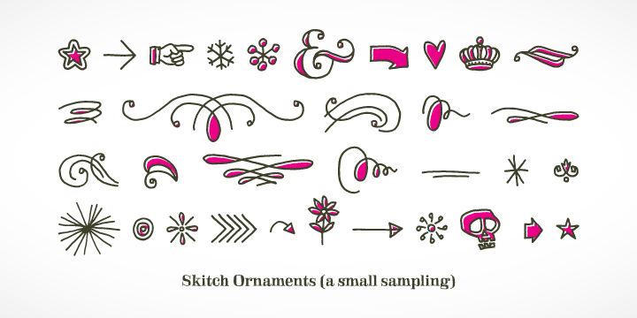 Skitch from Yellow Design Studio is a funky hand drawn serif with regular, solid, and fill options. It’s loaded with features including double-letter ligatures, discretionary ligatures and stylistic alternates, and is accompanied by an eccentric collection of ornaments and a set of expandable borders that can be mixed and matched for endless fun!