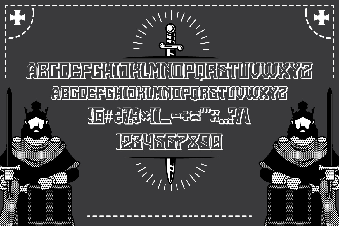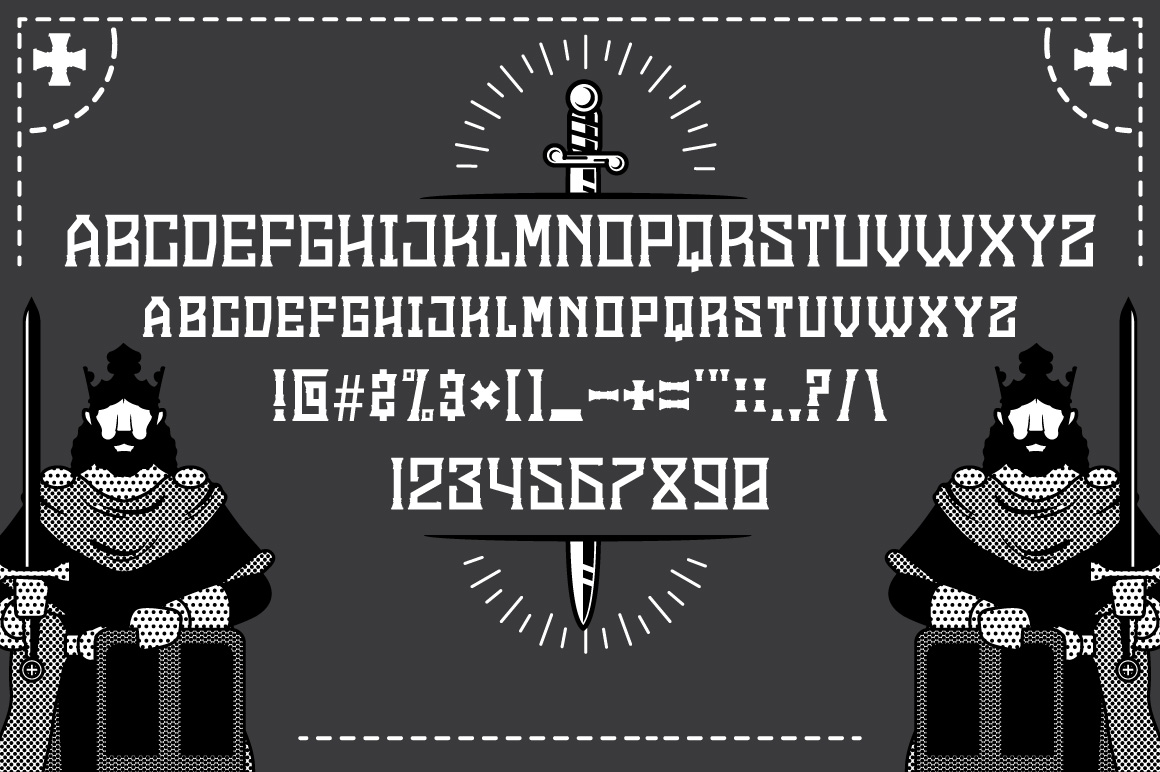 King Arthur is the font that inspired by chess and castle shaped. King Arthur Font is suitable for many design jobs like poster, t-shirt, logotype, music album, movie/story title, and many more… sky is your limit. There’s many free vectors (icon and character) as a bonus for al of you who buy this font.