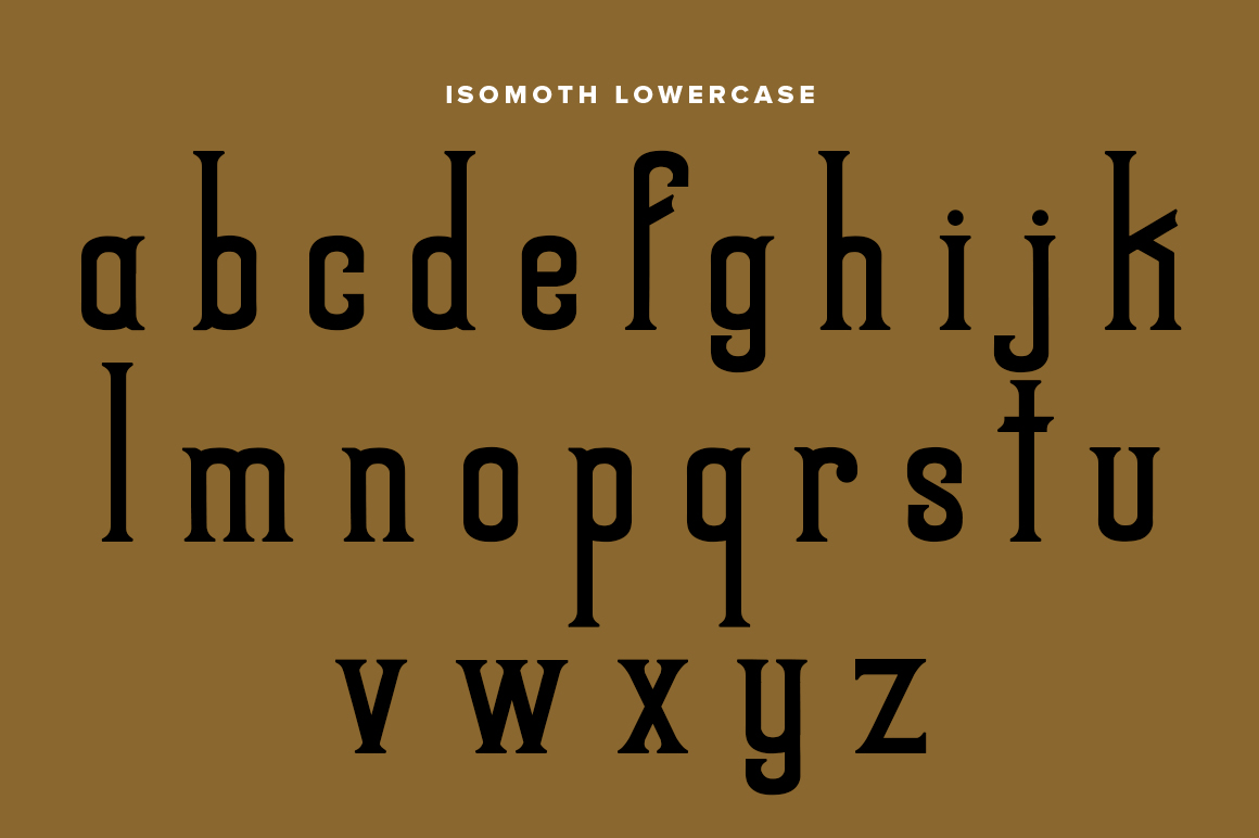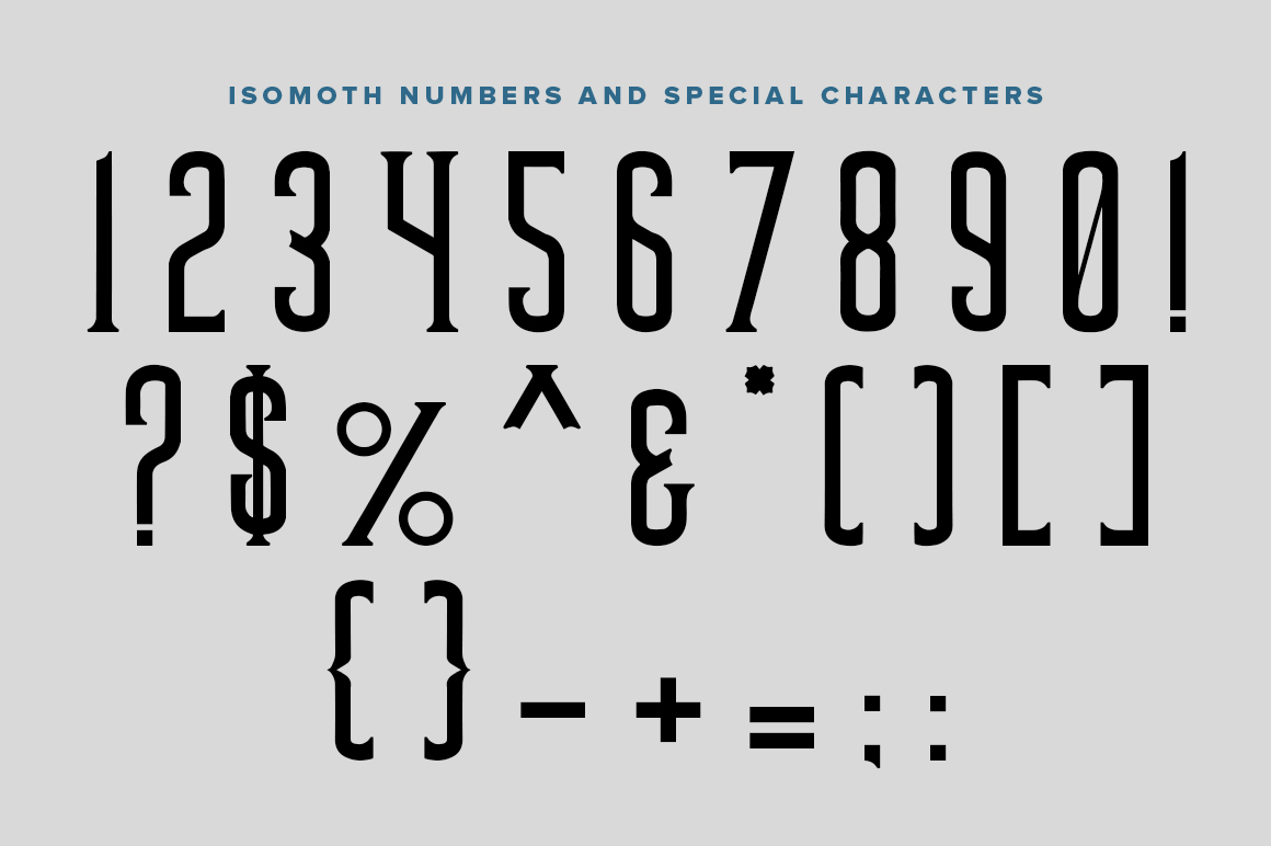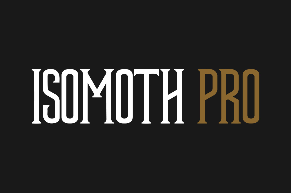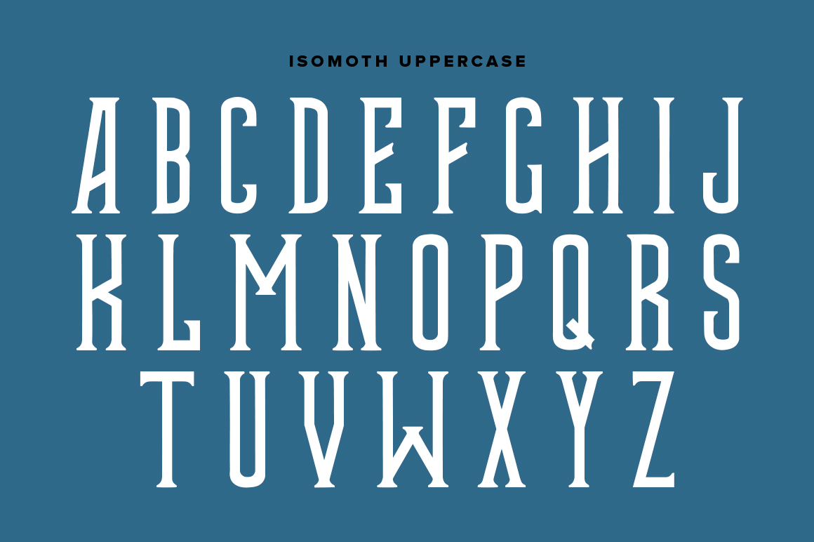 Isomoth Pro is the expanded and more complete version of the original typeface that started it all. In total this font has over 112 characters including uppercase and lowercase letter shapes as well as numbers, punctuation marks and a few new special characters.