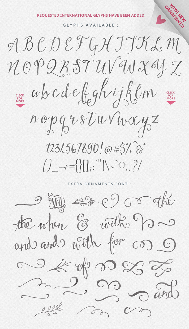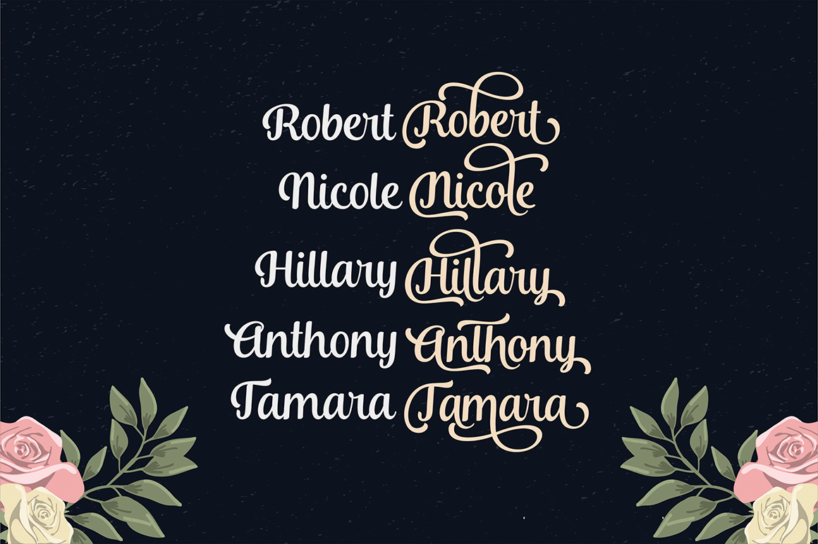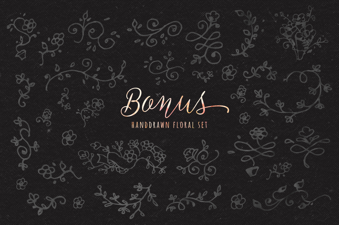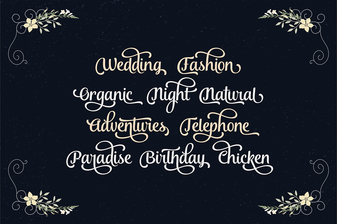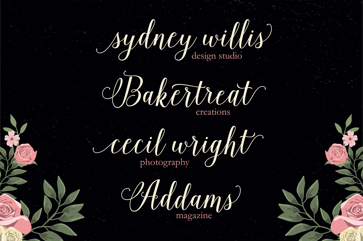 Sherina is hand written script that is fun and casual. It is suitable for wedding invitation, any greeting cards, retro / vintage design style, or any design that needs natural and personal touch. Mix and match the alternate characters to add an attractive message to your design. You will get this font with an extra bonus : Hand Drawn Floral Set which is can be combined together with the font to get something personal, fun, and stylish. The bonus was included in the package as Adobe Illustrator and EPS format. The alternative characters in Sherina Font were divided into several OpenType features such as Contextual Alternates, Stylistic Alternates, Stylistic Sets, Swash and Ligature. The OpenType features can be accessed by using OpenType savvy programs such as Adobe Illustrator and Adobe InDesign.