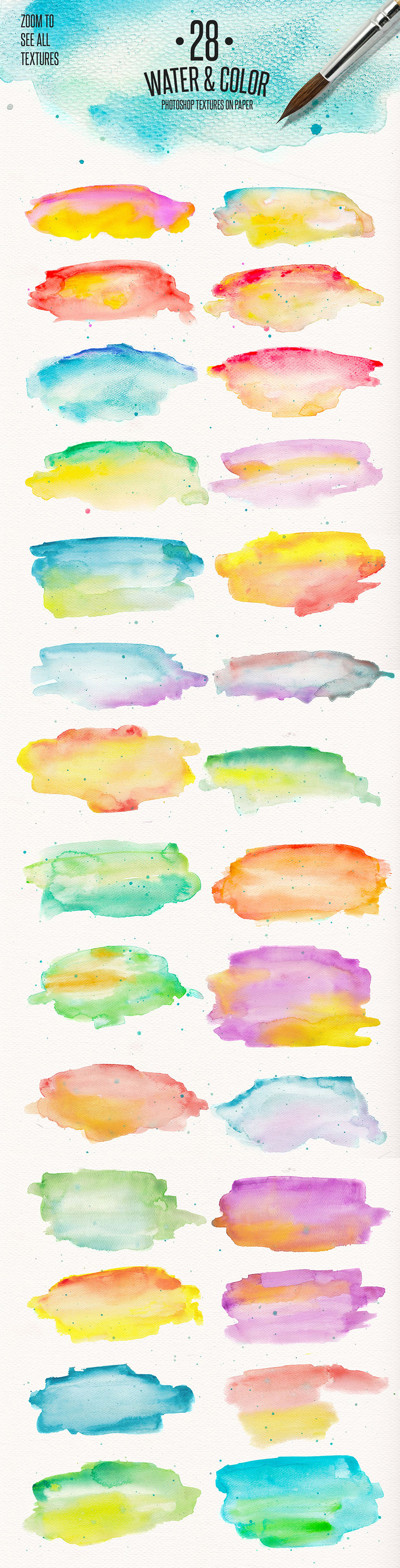 28 Water & Color Textures on Paper perfect for backgrounds textures, overlays, fills. You can combine the textures to achieve new and unique elements.