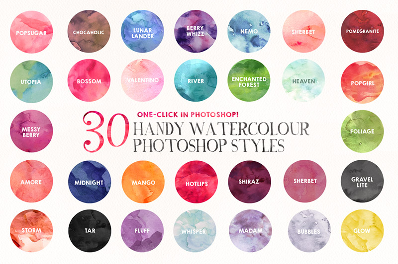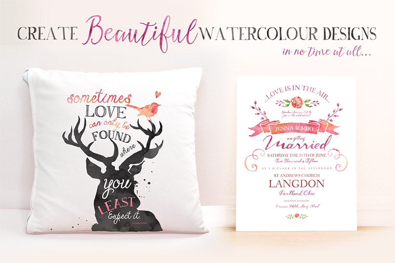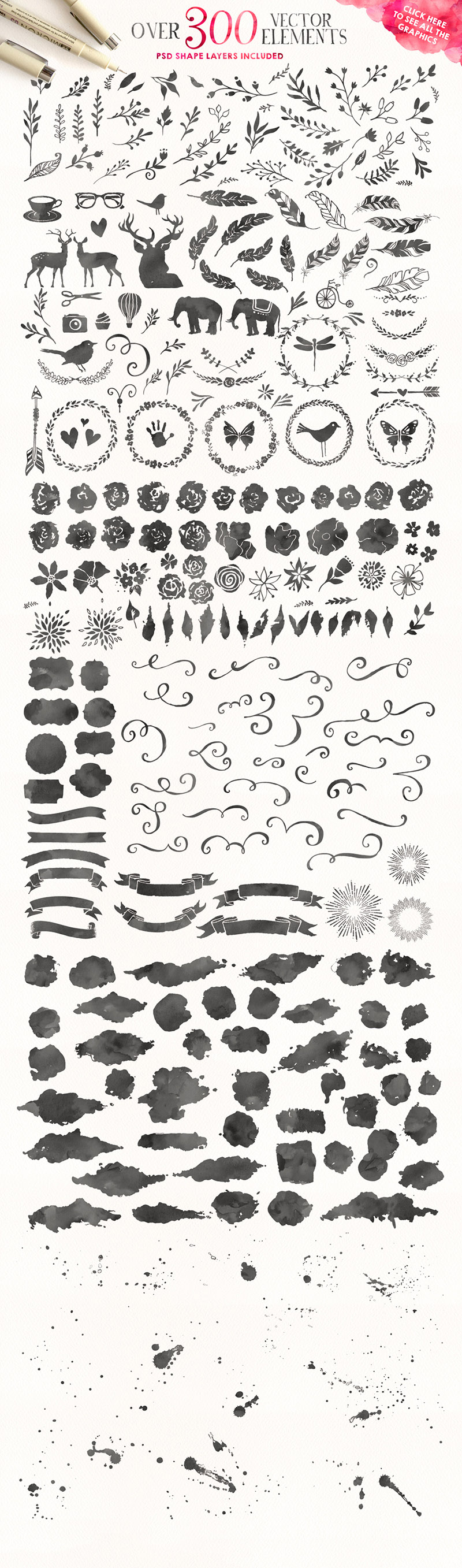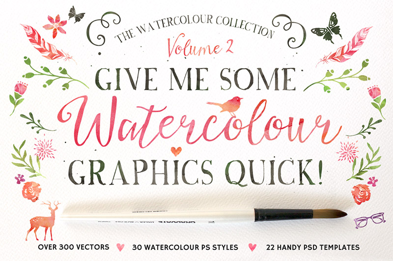 Say hello to ‘Give me some watercolour graphics quick!’ – a comprehensive collection of graphics to get your watercolour project off the ground and in the air in seconds. And if you need a little inspiration on how to get started, I’ve included a large selection of template psd files so you can see exactly how to put together your own creation using all the elements in this pack! A massive handy collection of carefully thought out and illustrated , authentically ‘wobbly-edged’ vector florals, leaves ,swirls, borders, banners, frames, splatters, and an assortment of various popular trending graphics. Use them along with the 30 bonus watercolour photoshop styles (included), to make your own greetings, logos, packaging, invitations, stationery, merchandise, posters, websites, digital presentations and more….you have everything you need to go wild!:)