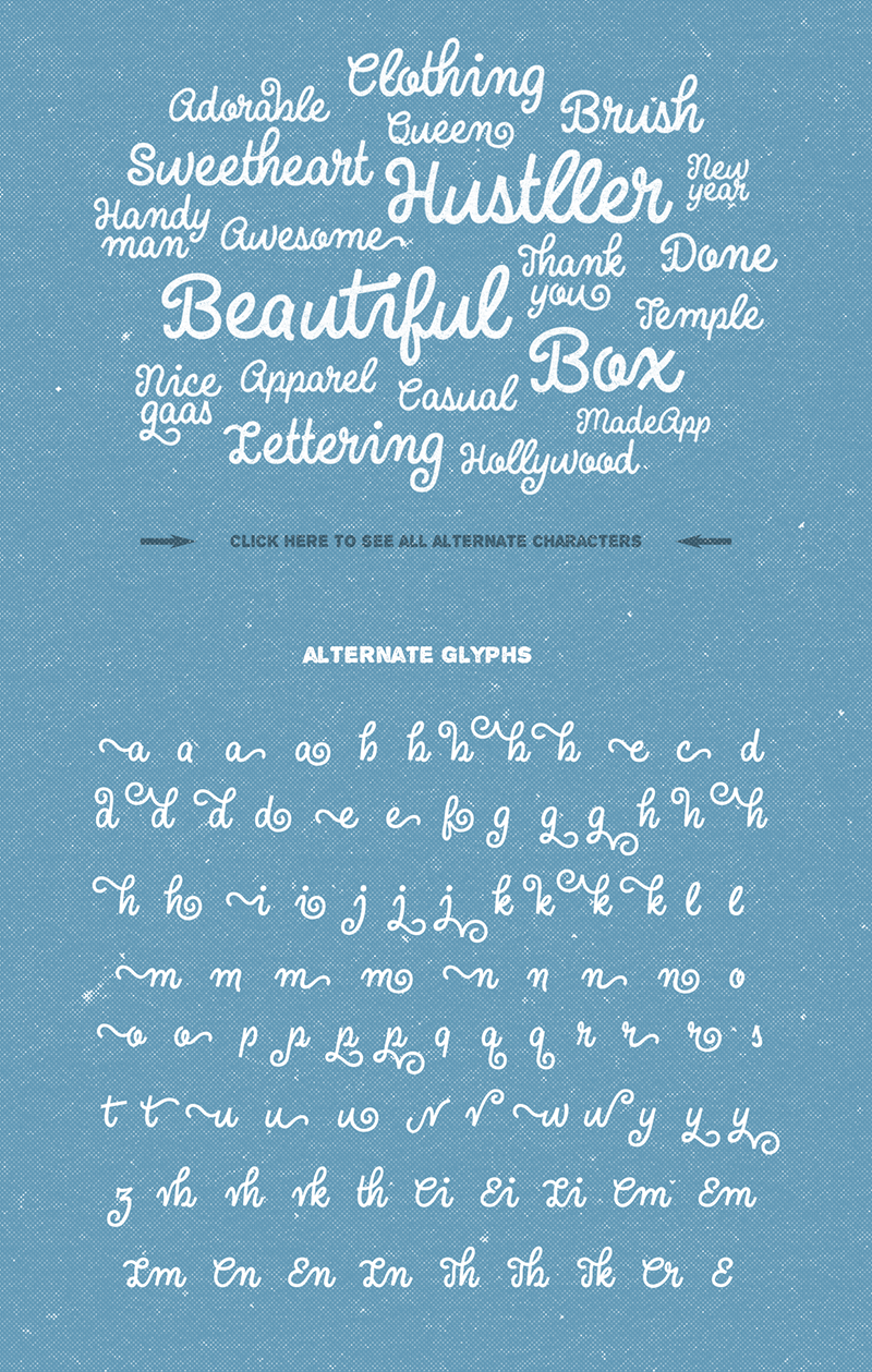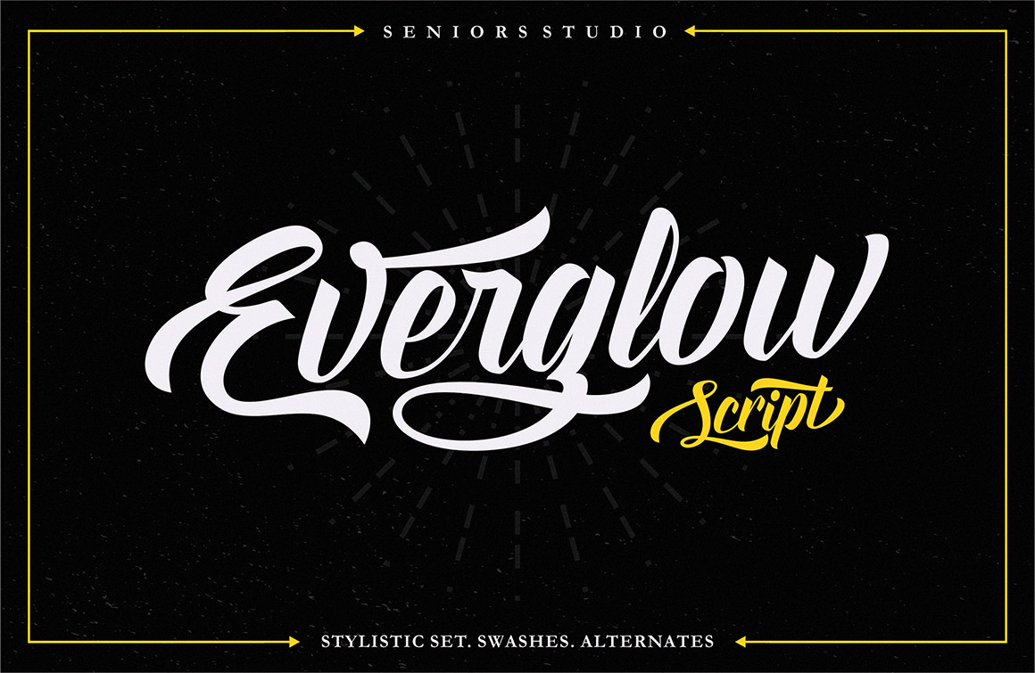 Everglow is a Script Retro font. a bold, classic,and fun vintage script. With almost 560 glyphs and and 322 alternative characters, contain with opentype features. Stylistic alternates, Ornament, swash and more. Can be used for various purposes.such as logos, wedding invitation, t-shirt, letterhead, signage, news, posters, badges etc. To enable the OpenType Stylistic alternates, you need a program that supports OpenType features such as Adobe Illustrator CS, Adobe Indesign & CorelDraw X6-X7. How to get access alternate glyphs from open type fonts: http://youtu.be/iptSFA7feQ0