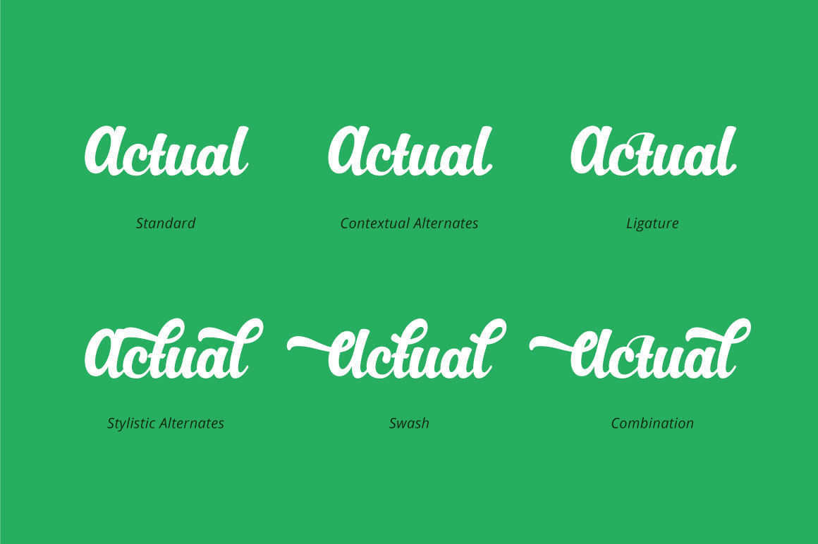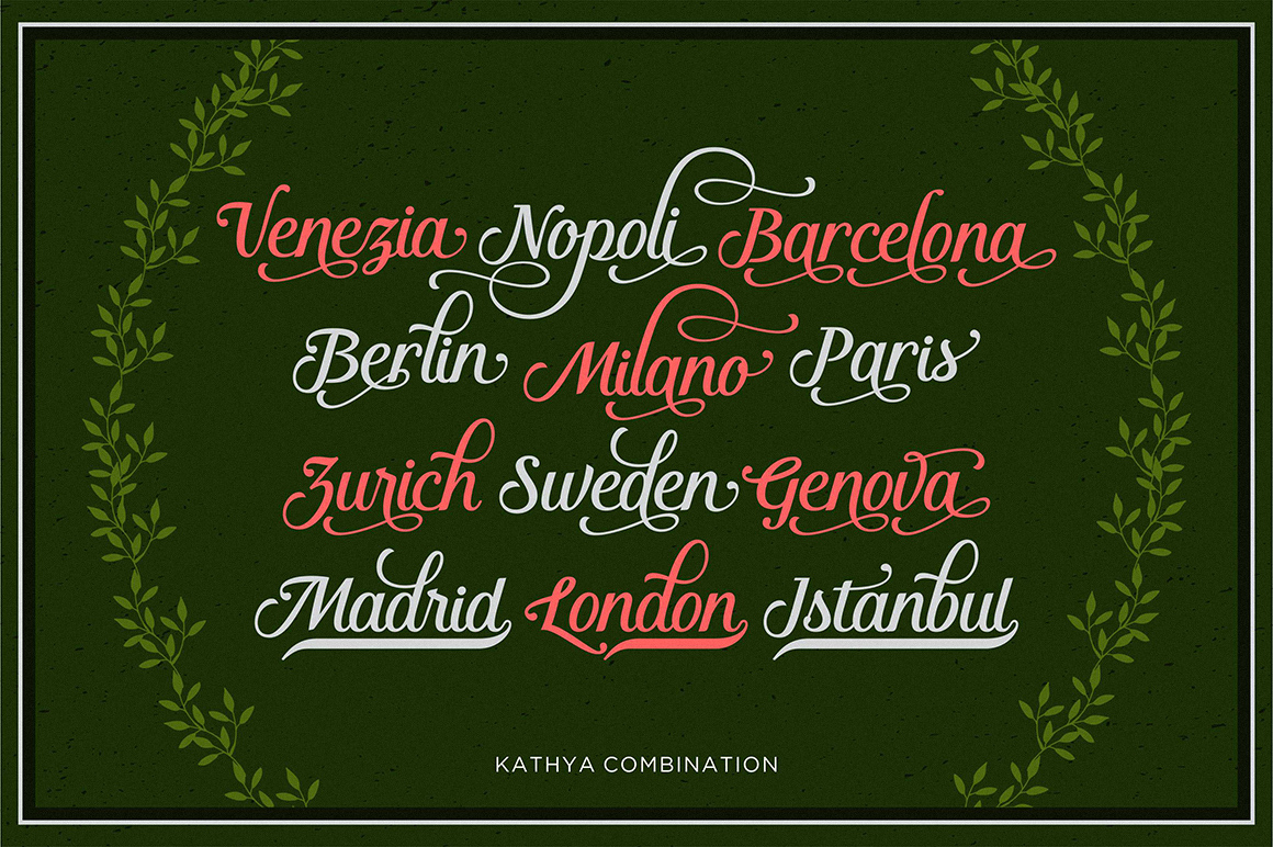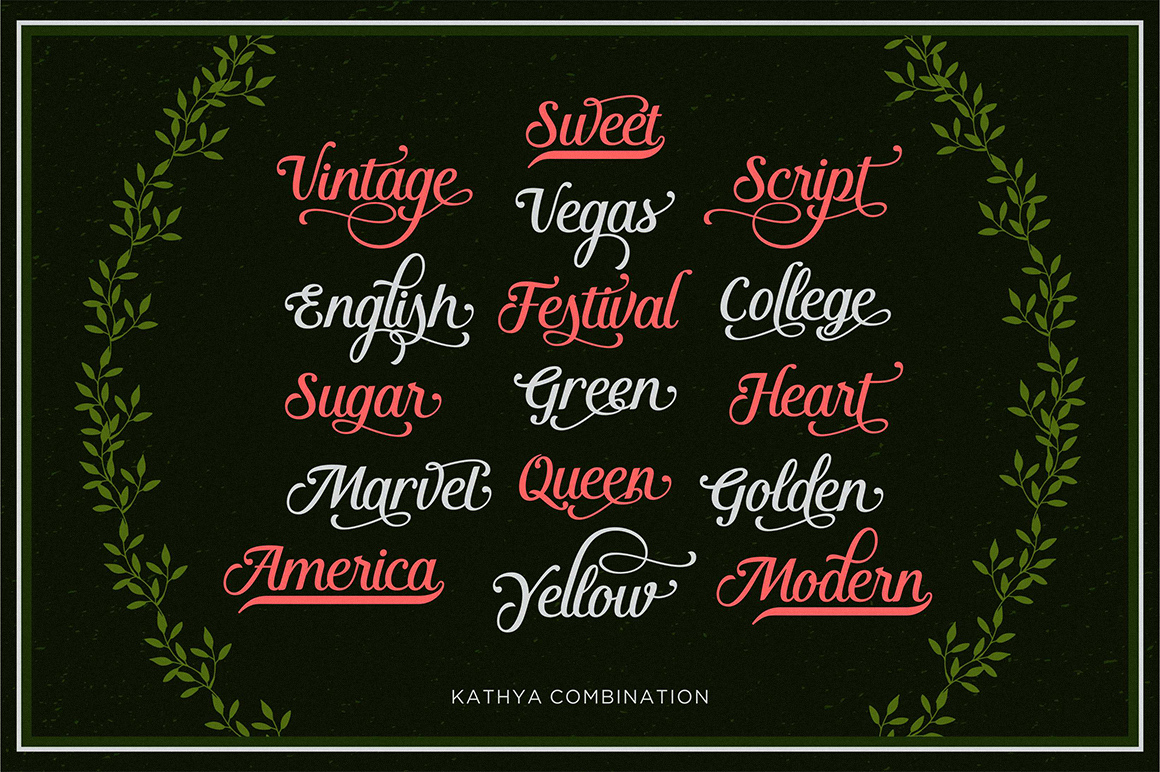 Kathya Script is a contemporary calligraphic typeface, a mixture of retro script and modern sans serif. get a classic and elegant touch. With almost 430 glyphs and 176 alternate characters, multiple language support, the choice of useful ligatures, swash and more. Can be used for various purposes.such as logos, wedding invitation, t-shirt, letterhead, signage, lable, news, posters, badges etc. To enable the OpenType Stylistic alternates, you need a program that supports OpenType features such as Adobe Illustrator CS, Adobe Indesign & CorelDraw X6-X7. How to get access alternate glyphs from open type fonts: http://youtu.be/iptSFA7feQ0