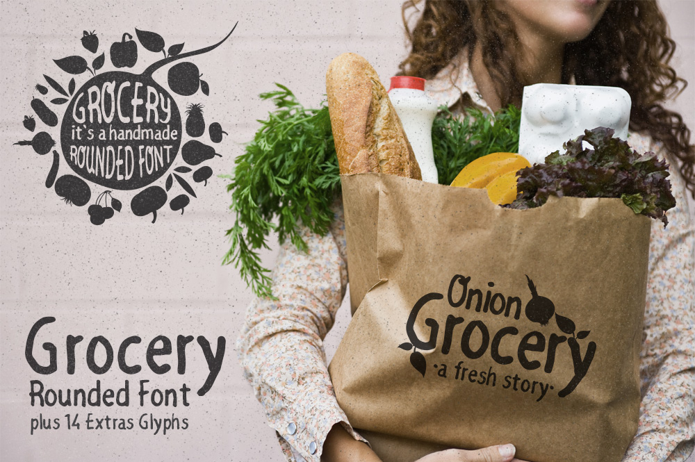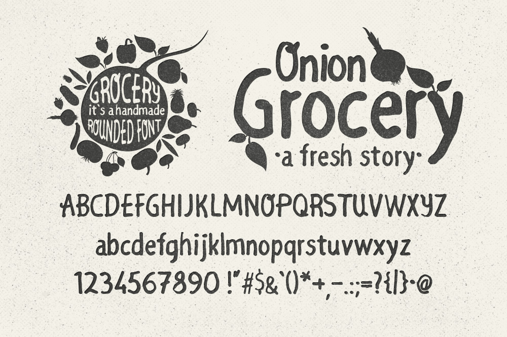 This is a handmade rounded font. The font includes all letters uppercase and lowercase all punctuation signs and 14 bonus vegetable / fruits glyphs.