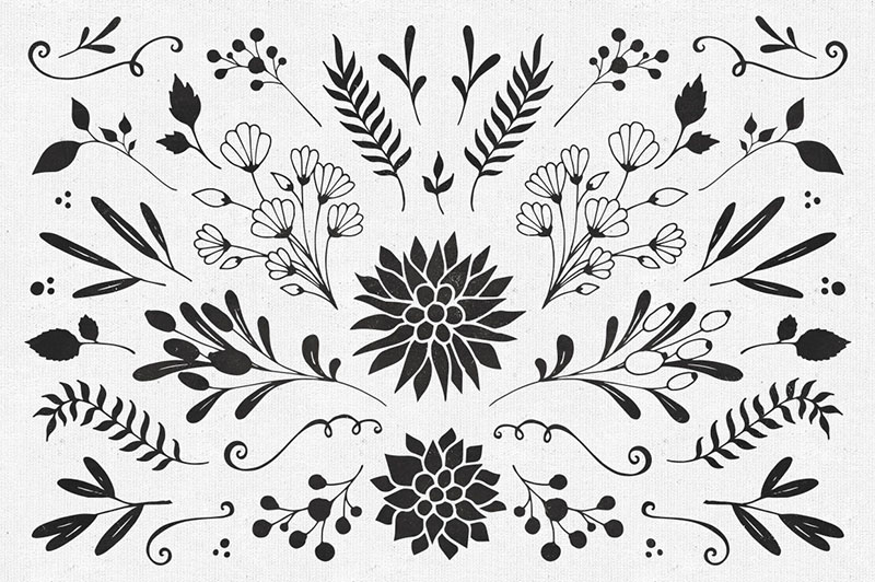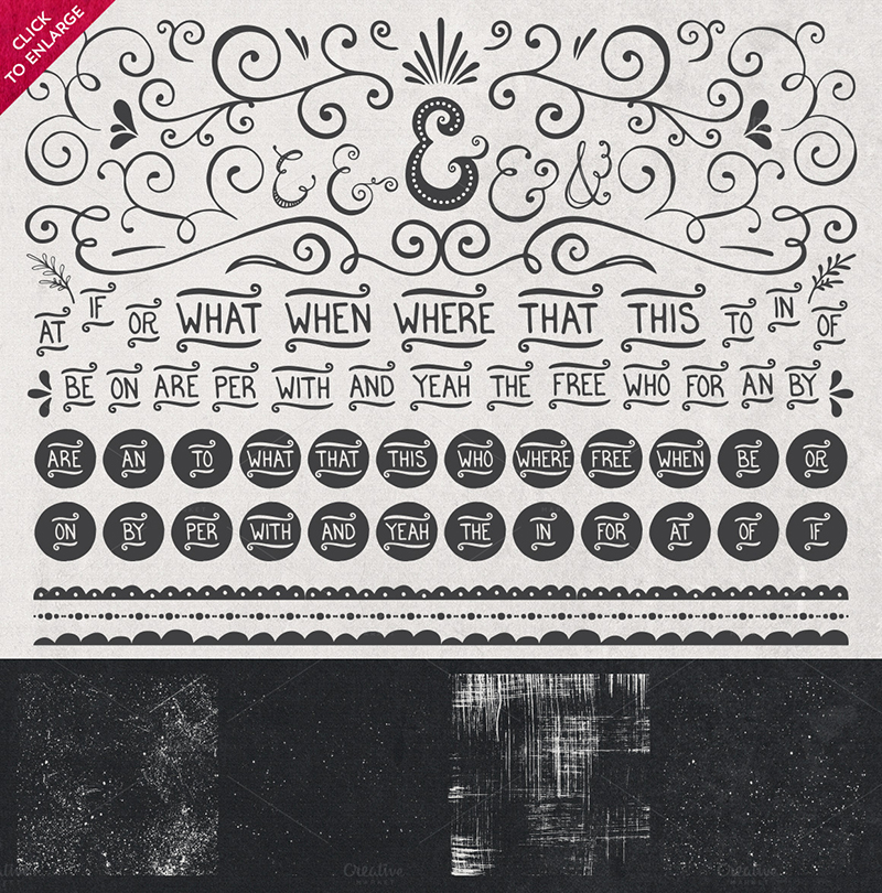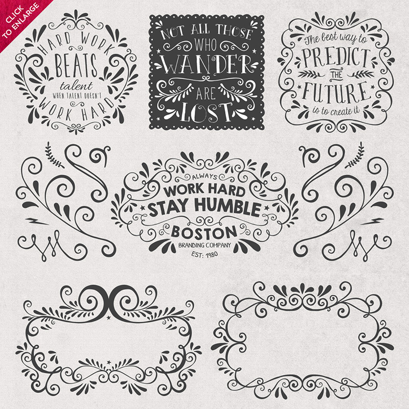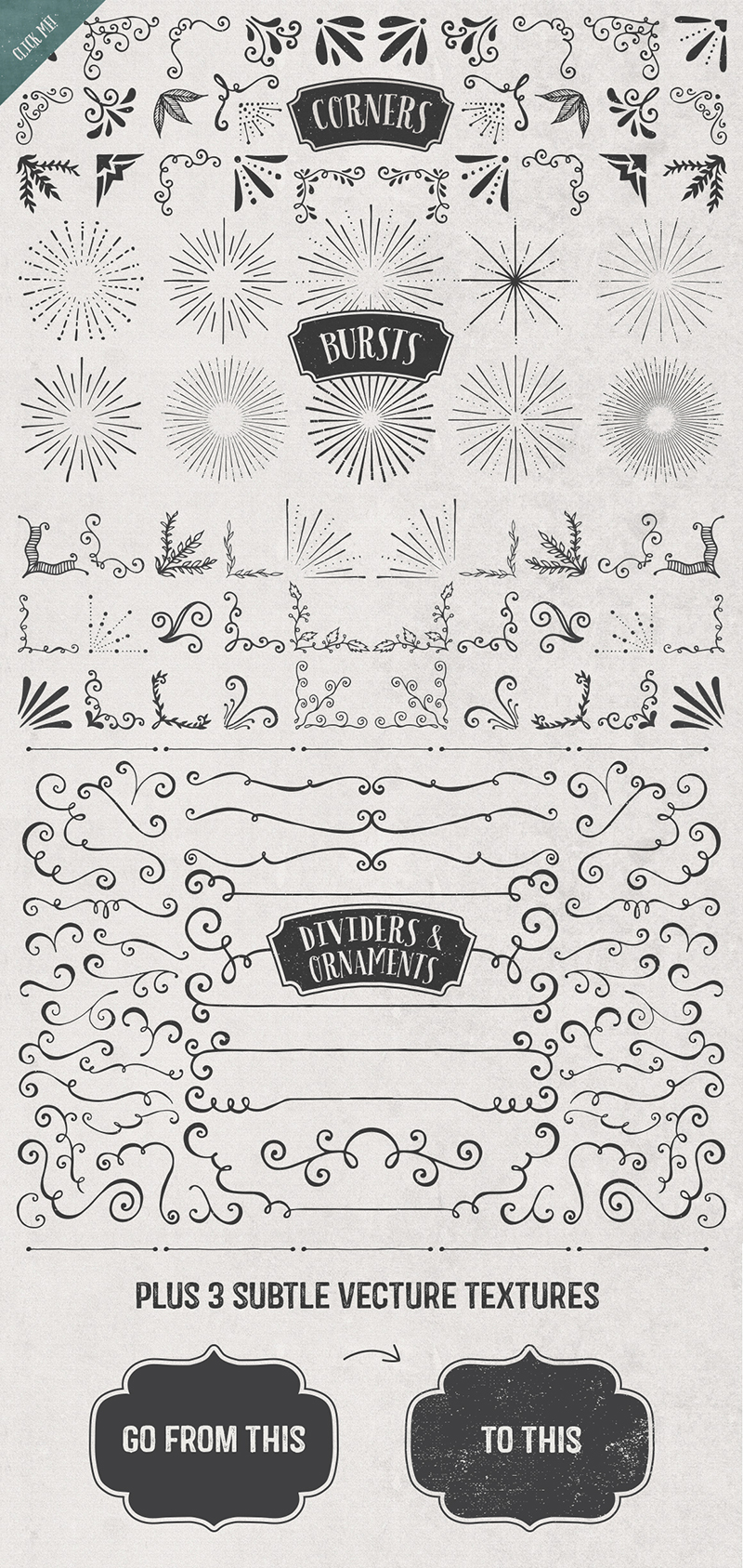 Ready for some tasty new vectors? I wanted to create a package offering everything that I use when I take on custom type projects. This beefy pack includes ornaments, droplets, lacey shapes, floral elements, decorative swirls, curly dividers, frames, ampersands, banners, vector textures, pre-designed typographic templates, catchwords, and more. Everything is crafted by hand, everything is new, and it’s all for your creative pleasure. Have fun making some awesome typography projects (or logos…or whatever you want). 🙂 Impress your friends, impress your boss and make your mama proud. 😉