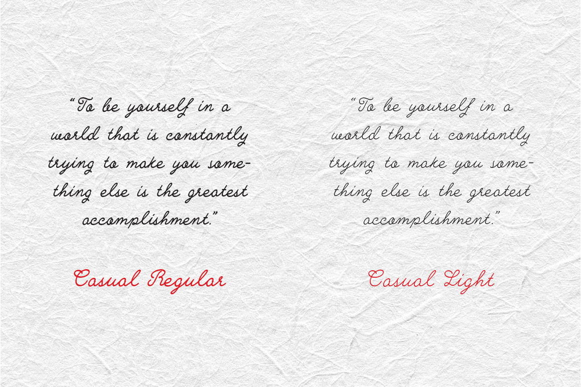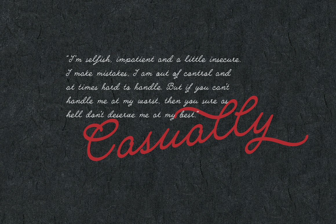 Casually is a fun and flowing handwriting script that giving the feel of natural writing and hand-made. You can use it to make an impression in a variety of designs such as invitations, greeting cards, logos, headlines, t-shirts, etc. Casually contains 122 beautiful alternative characters which can be combined to fit your design. The alternate characters divided into several OpenType feature such as Ligature, Stylistic Alternates, Contextual Alternates, and Stylistic Set. You can access all the characters by using OpenType savvy program such as Adobe Illustrator and Adobe InDesign.