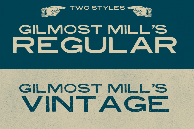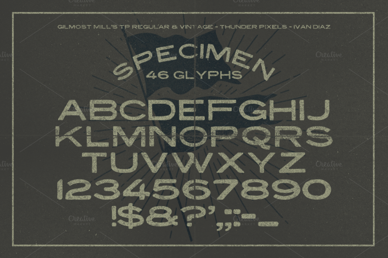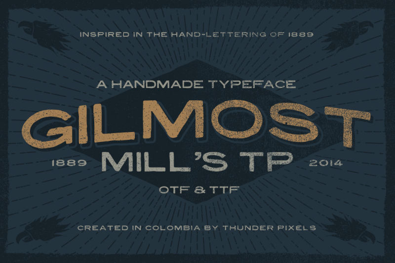Gilmost Mill’s TP is a handmade typeface and created by ThunderPixels, is inspired by the first typefaces (1880-1897) collected in catalogs of products and used mainly for titles. With a hand-drawn aspect, Gilmost Mill’s TP brings a vintage ambience to any design, carefully crafted preserving structure and form of any traditional font.