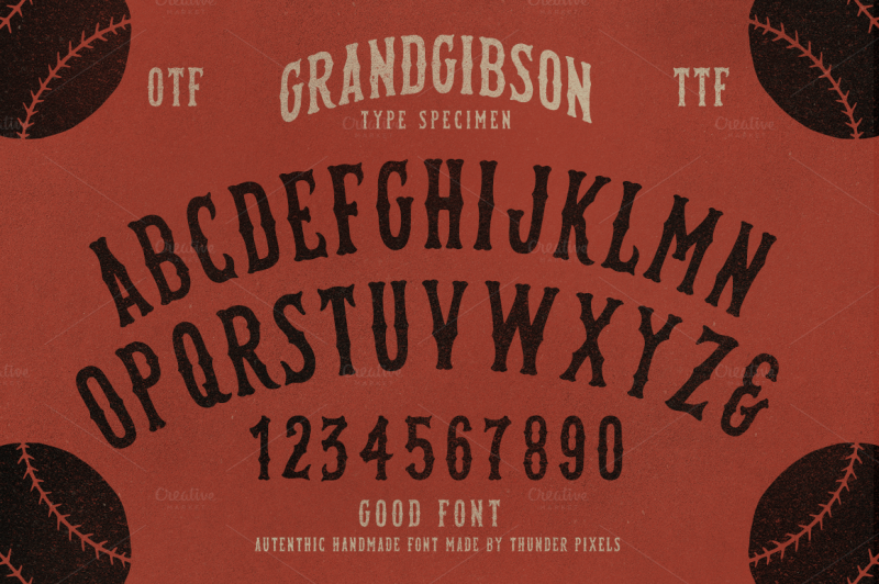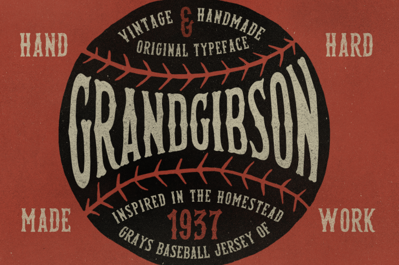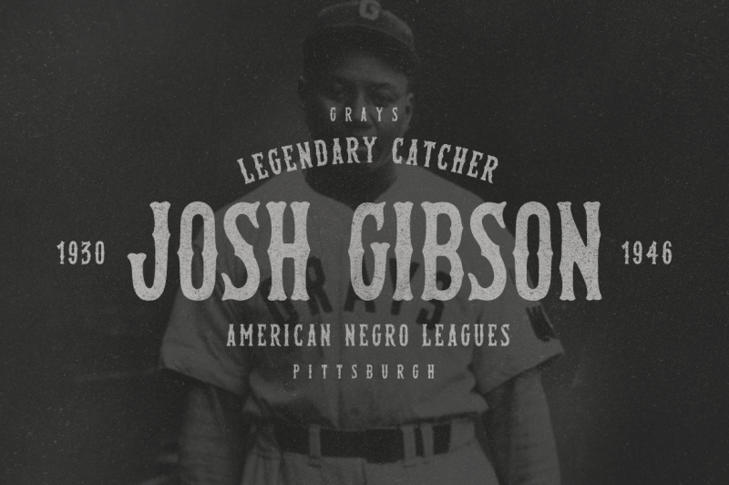 GrandGibson Typeface is based and inspired by typography “Grays” in the official Jersey worn by “Homestead Grays Team” in the American Negro League of Baseball in 1937 and its name honors one of the most greatest catchers of the time, Joshua “Josh” Gibson. It is made entirely by hand and digitally perfected, we have also included 18 vintage vector elements of baseball for use as figural cameos.