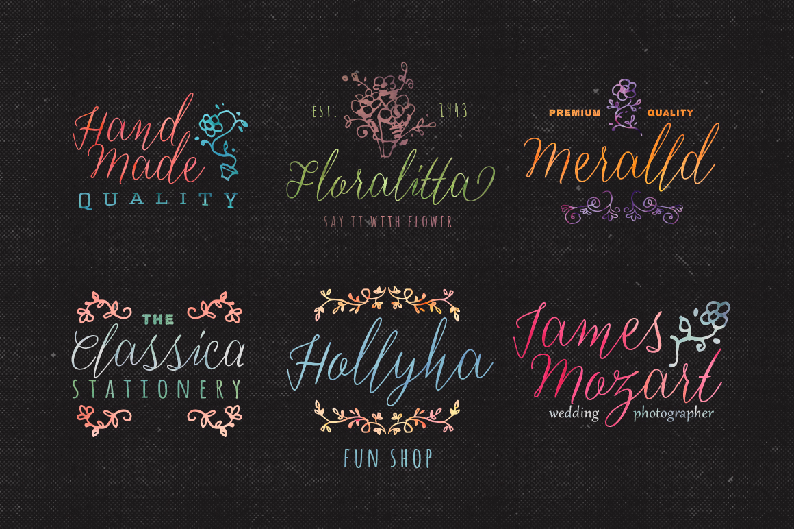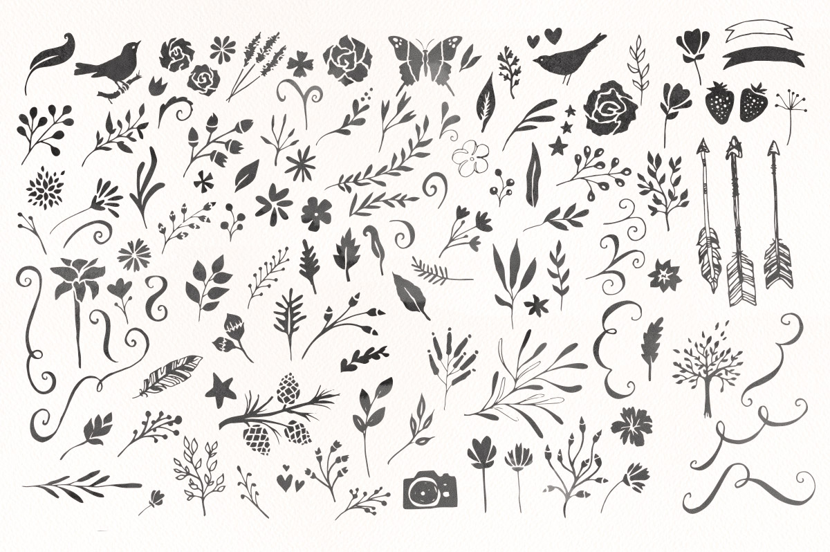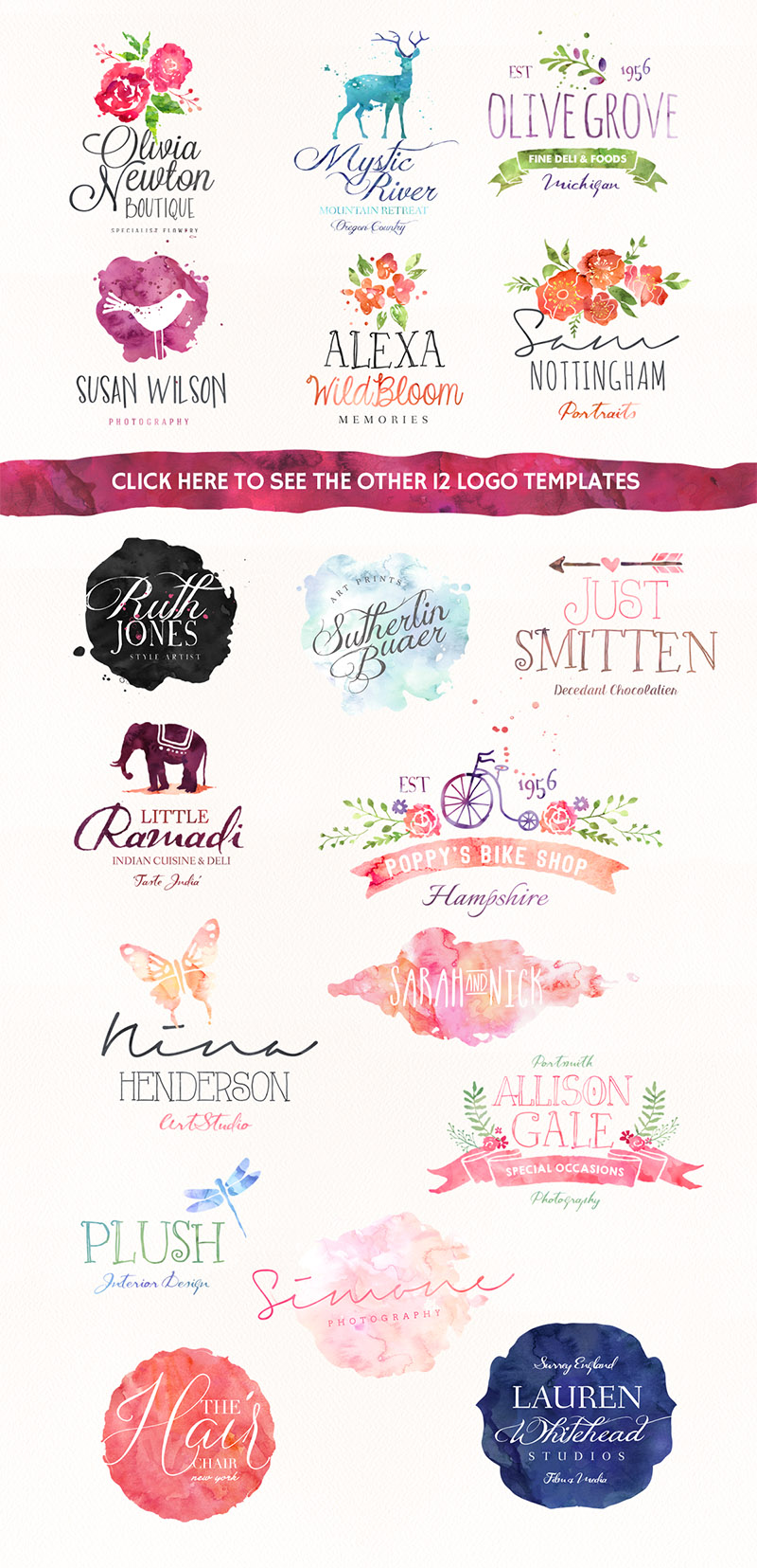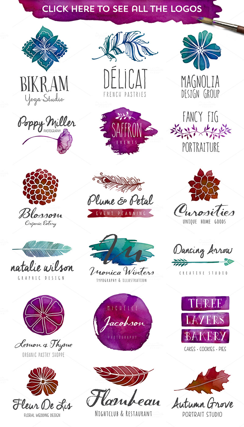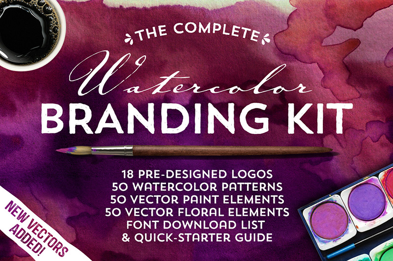 I’ve been working long and hard on this one, and now it’s finally ready to go! Introducing the Complete Watercolor Branding Kit! Why complete? Because it has everything you need to design a totally awesome, vector watercolor logo. That’s right, each element was carefully drawn or painted, then scanned and vectorized, so that you have perfectly crisp graphics and total control over the size and shape of your logo. Go ahead and get crazy! Layer paint elements and splatters, or pair up floral elements for something completely unique! Each element has also been placed on its own Photoshop layer, so no more using the lasso tool to grab your graphics. Now, you can simply open the .psd, right-click on the icon you want, apply one of the watercolor patterns, add your text, and BOOM! You’ve just created your own, gorgeous watercolor logo. How cool is that?! And if the vector goodness wasn’t enough, I’ve assembled 18 watercolor logos to give you some inspiration and jump-start your creativity. Feel free to customize an existing logo, or use any combination of elements to create your perfect watercolor design!