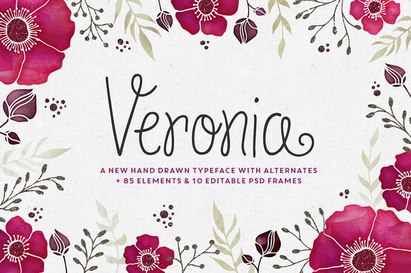 Make Media Co and the Cultivated Mind Type Foundry have joined creative forces to bring you Veronia! A sweet & versatile mono-line typeface, along with over 85, unique floral elements and 10 adjustable Photoshop frames. Verona comes in two weights with over 30 alternates AND Latin Pro characters.