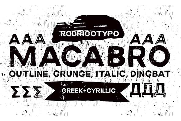 MACABRO FAMILY, is a grunge typography, handmade whose concept, fear terror phobia among others, Cyrillic and Greek are also design also has several varieties, from italic, outline, rough, etc.