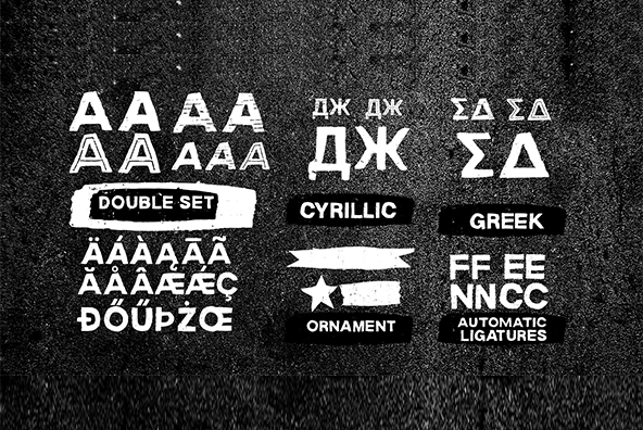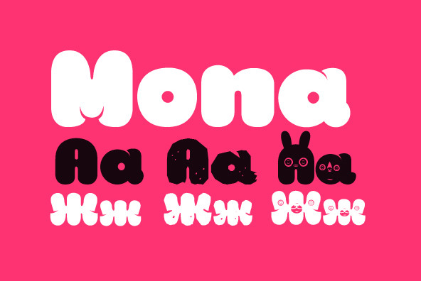 “Mona” is a display typeface with 3 variants: MonaBlack Regular (the standard version), MonaRock (a raw or even grunge version), and MonaStyle (where the letters are replaced by illustrations and pictograms). This typeface includes also Cyrillic.