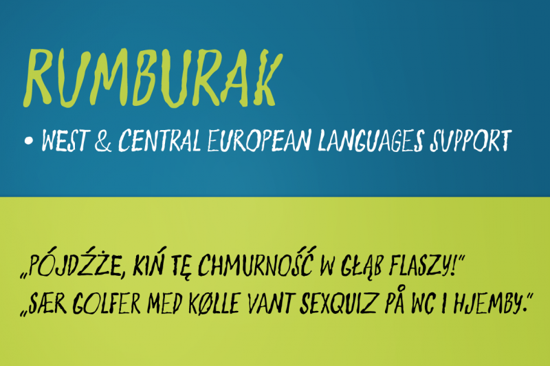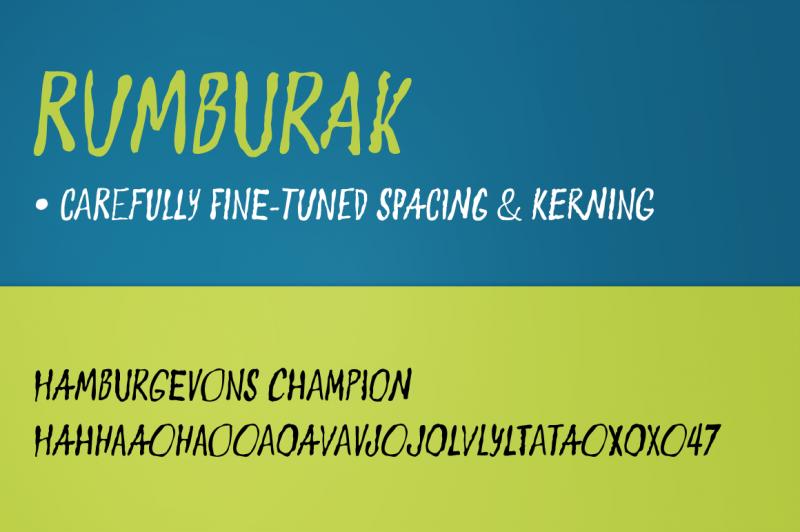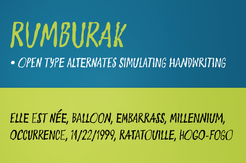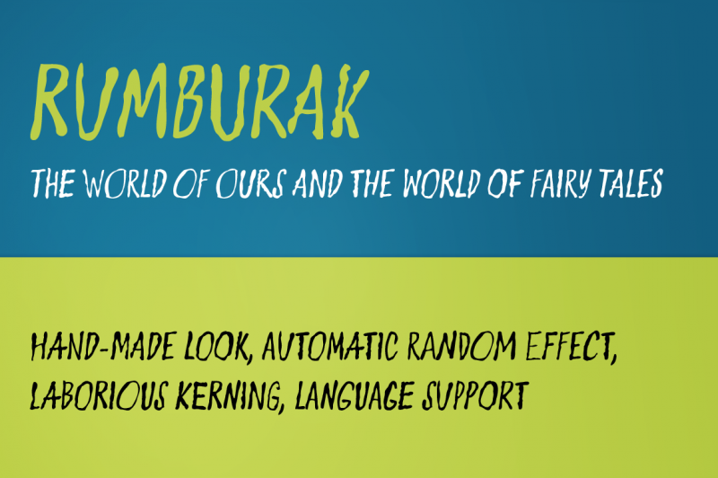 This handmade-looking, playful type is inspired by the titles of a few old Czech movies for children. With its irregularity and numerous alternates, Rumburak simulates live handwriting. When the font is used in OpenType-savvy applications, the 4 variants of glyphs are automatically alternated to achieve a random-like effect. The spacing and kerning were carefully fine-tuned by Igino Marini and the kerning table contains kerning pairs for use with the random feature turned on or off. The font includes multi-language support. Enjoy!