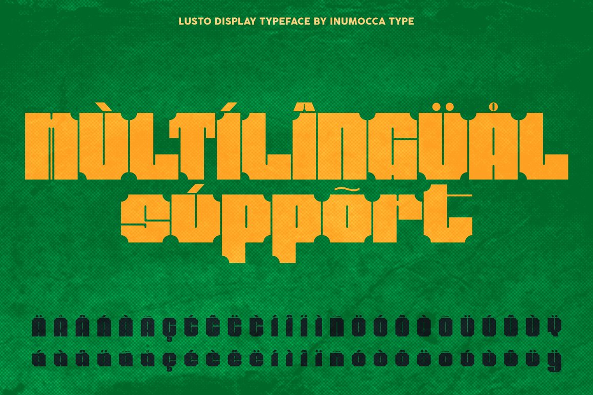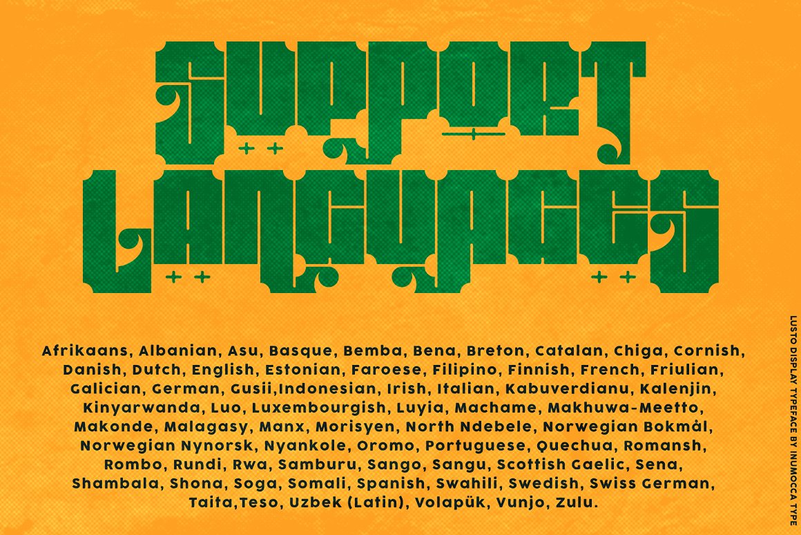 Lusto display typeface , come from mexican style and atmosphere. Bold, Powerfull and unique glyphs character. with some unique Alternates for covering your Project, like Branding, Movie Title, Headline Letter, Bookcover or Book Content, Magazine cover, Poster, Quotes Lettering, Logos, and more your project design.