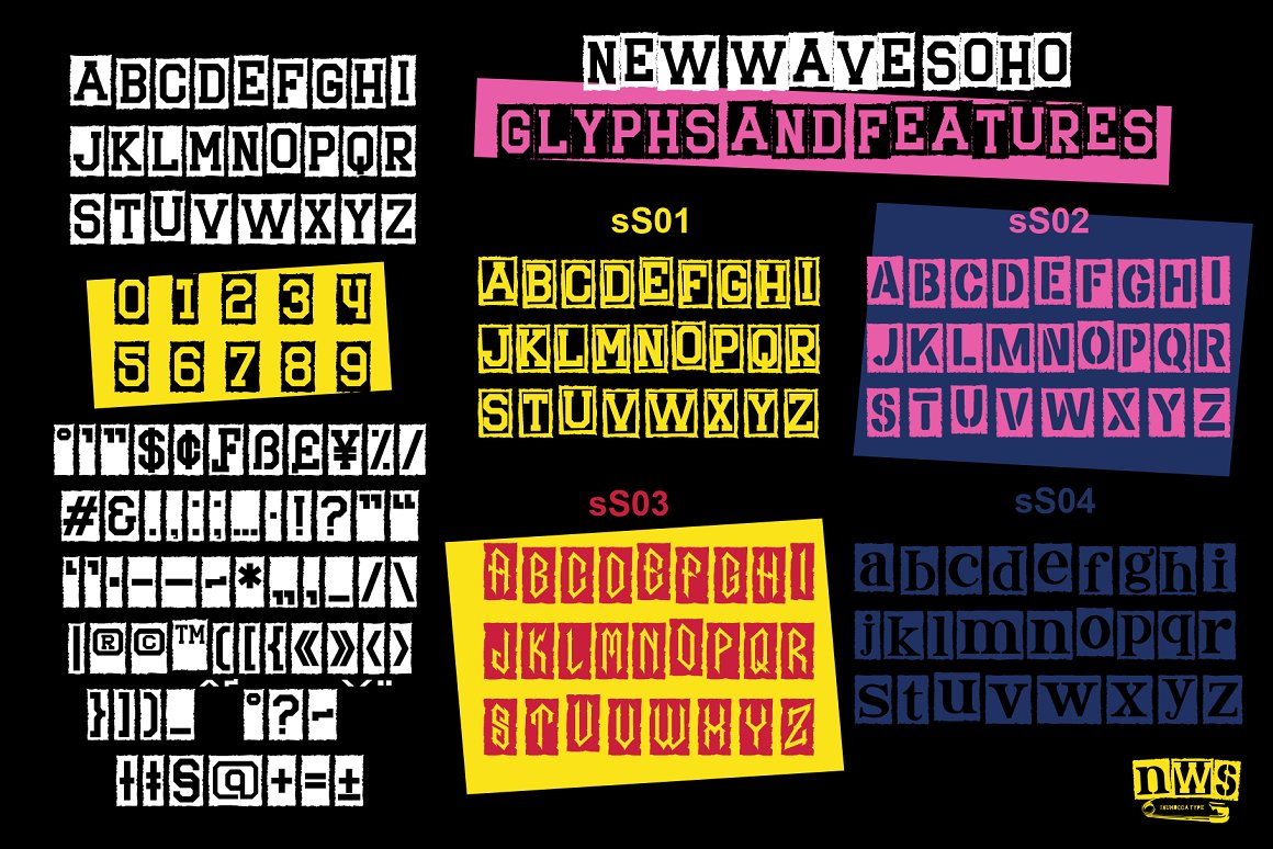 New Wave Soho Display Font, inspiration from punk poster, full energy, rebel, anti mainstream and dare to take something different. you will feel like you are walking in the 70s era. New Wave Soho presenting more alternates glyphs to pour your wild ideas. simplel for access of Unique Alternates Exellent typeface to use for covering your Project, like Branding, Movie Title, Headline Letter, Bookcover or Book Content, Magazine cover, Poster, Quotes Lettering, Logos, and more your project design.
