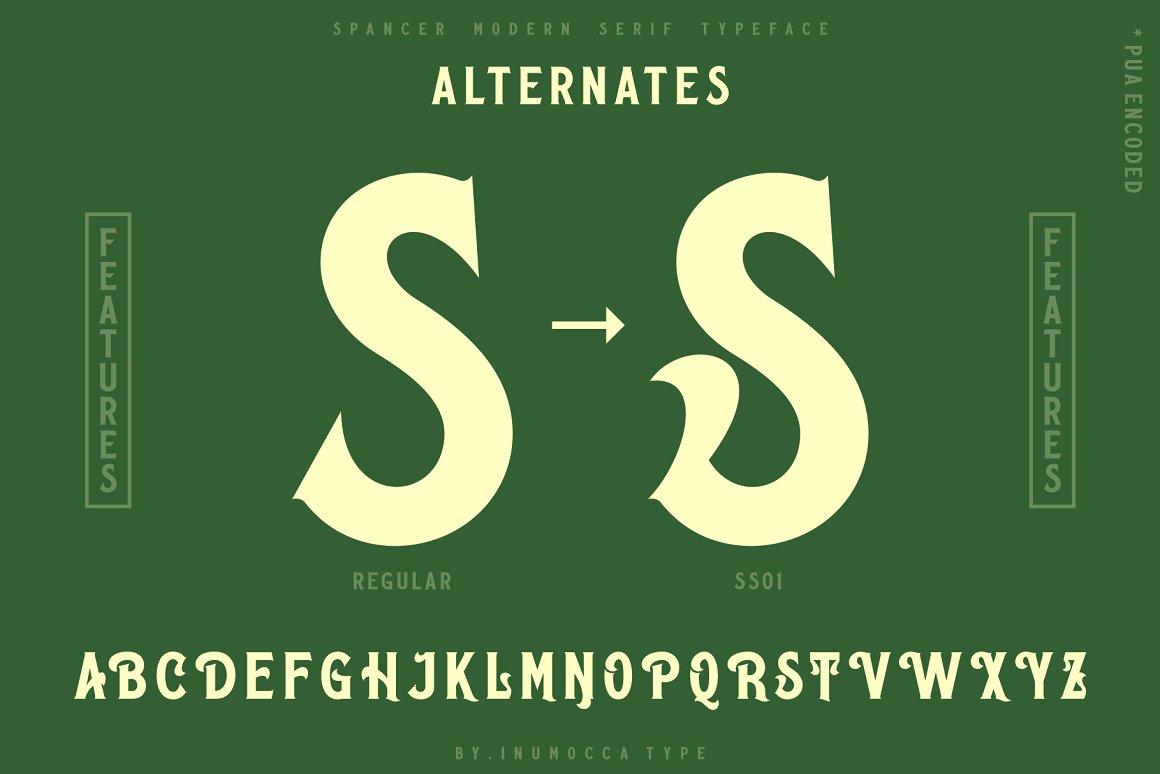 Spancer Modern Serif Typeface , simple and powerfull. come with some simple Alternates for covering your Project, like Branding, Movie Title, Headline Letter, Bookcover or Book Content, Magazine cover, Poster, Quotes Lettering, Logos, and more your project design.