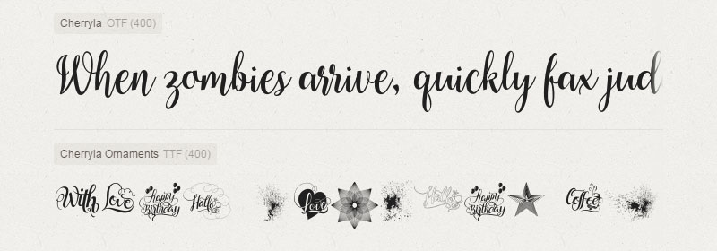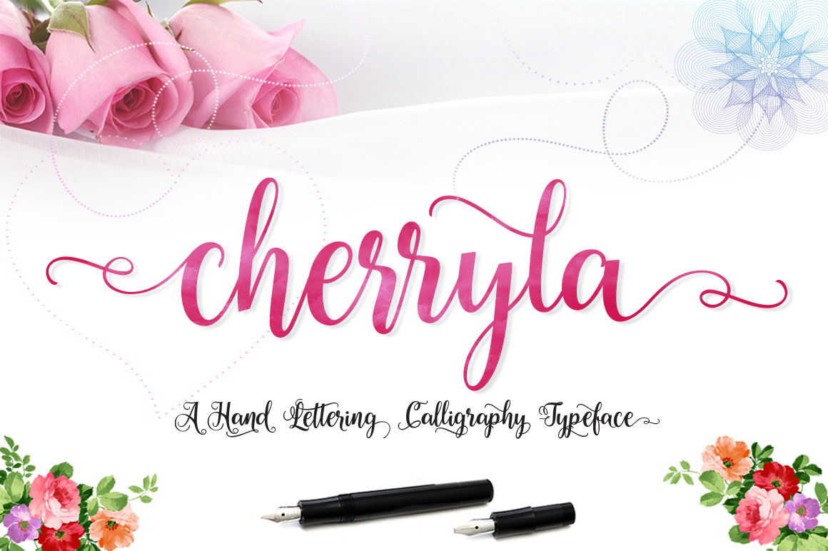 Cherryla is a modern calligraphic handwriting. Suitable for wedding invitations, greeting cards, design of water-based paints, correspondence, and a variety of other purposes.