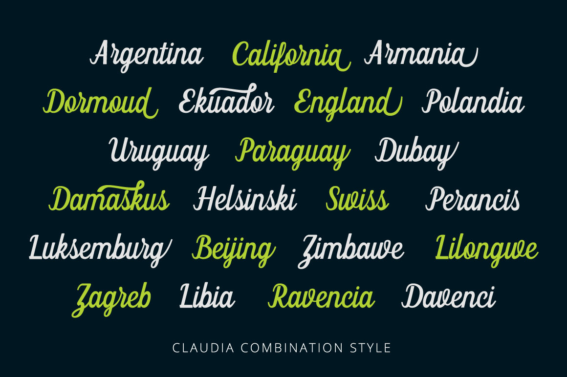 Claudia is a formal and modern script typeface. It was designed as a display typeface that contains 255 glyphs in total and more alternative characters to improve your design. This font have multiple language support, the choice of useful ligatures, swash and more. You can use it as a logo, badge, packaging, headline, poster, t-shirt/apparel, greeting card, and wedding invitation. The alternative characters in this font were divided into several OpenType features such as, Stylistic Alternates, Stylistic Sets, and Ligature. The OpenType features can be accessed by using OpenType savvy program such as Adobe Illustrator and Adobe InDesign.