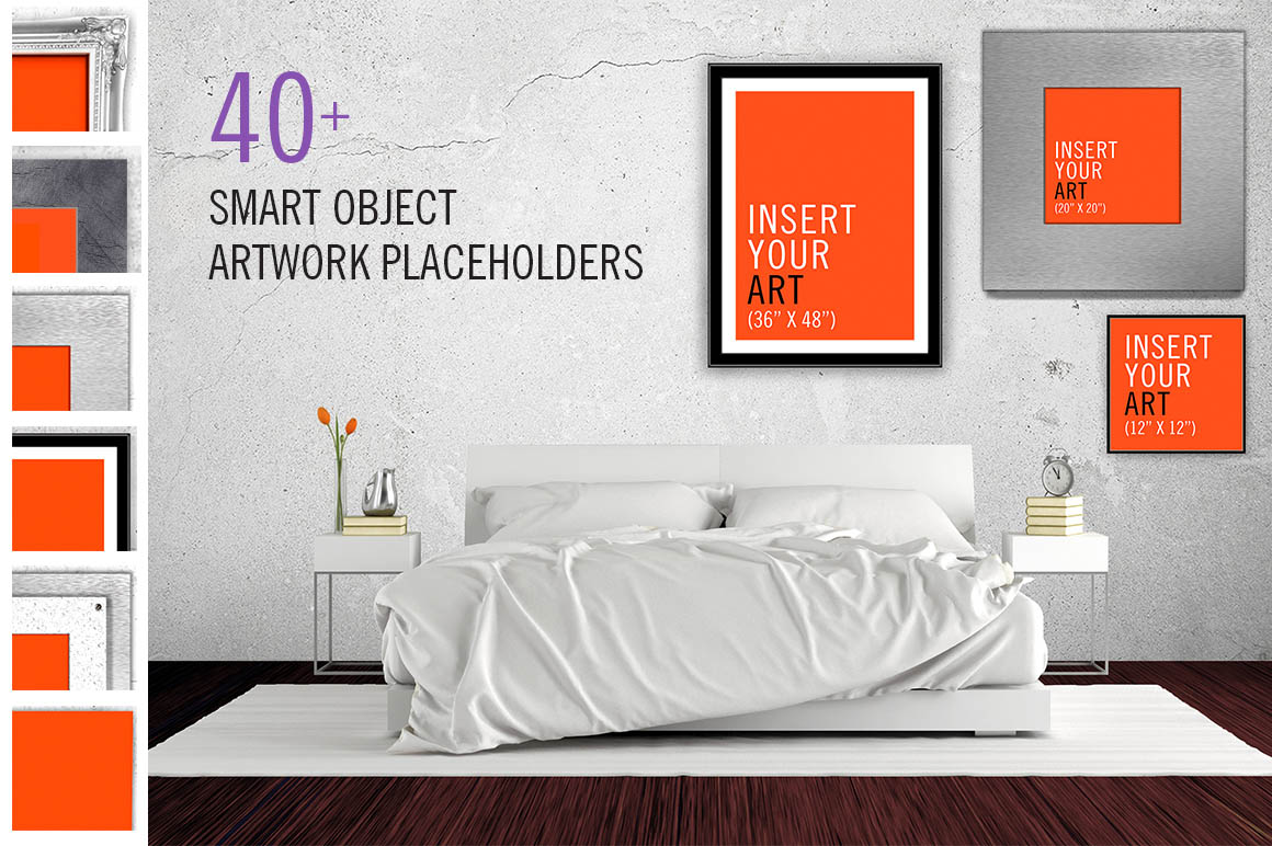 As a painter, I am always looking for creative ways to display my work online. This is a great tool to show off your art for your Etsy shop, website, blog, social media, portfolio presentations etc… In this .psd you can “hang up” your art by placing your work within a realistic setting and tailor it to YOUR style of art. With the number of smart object frames and canvases, background and color options, your presentation opportunities are endless!