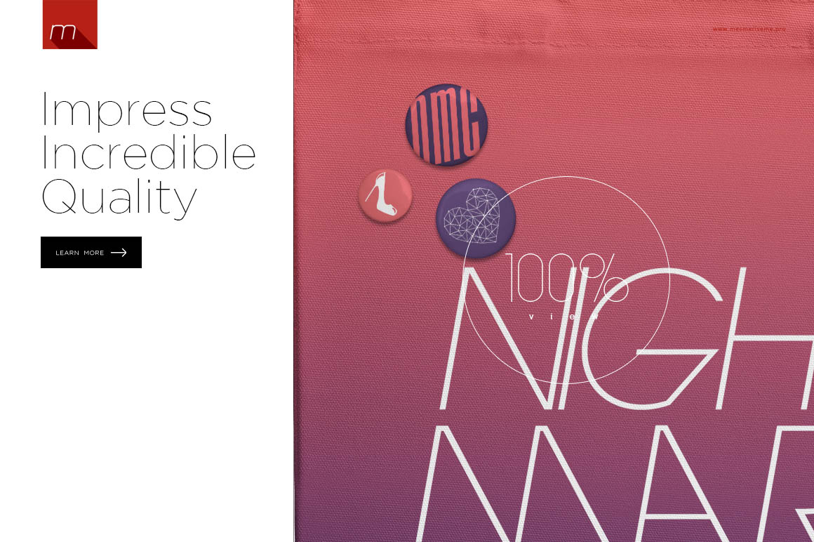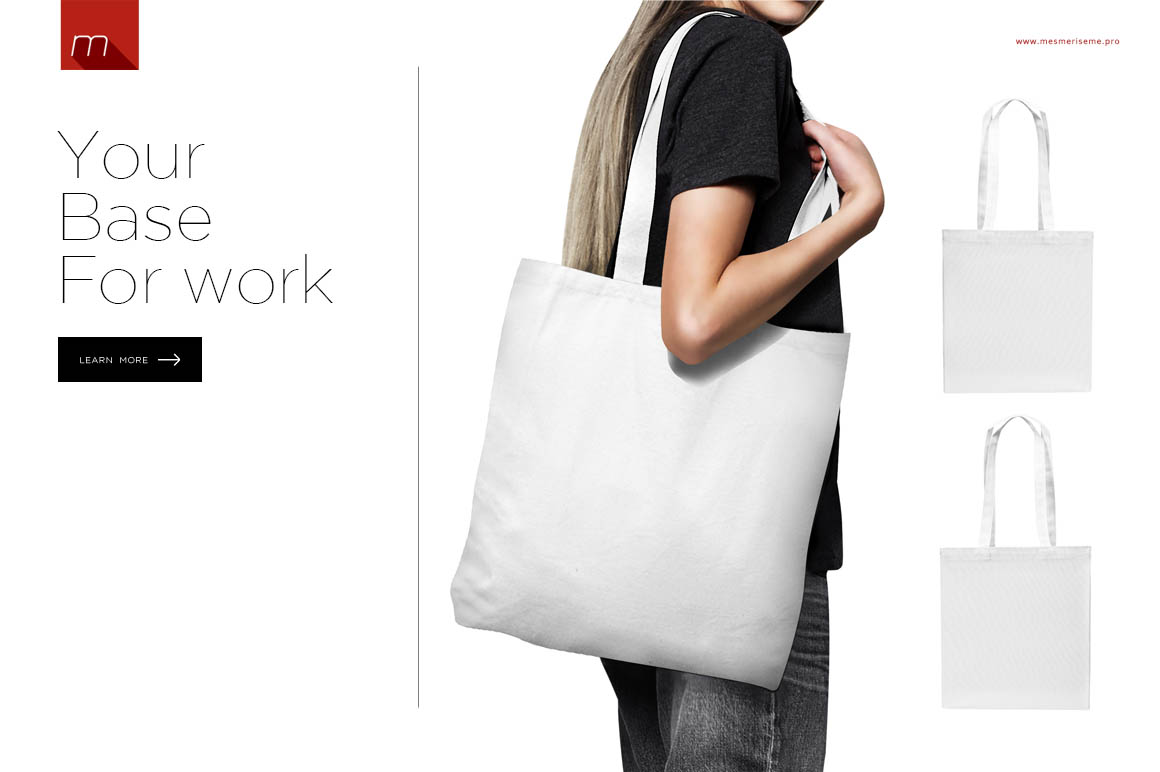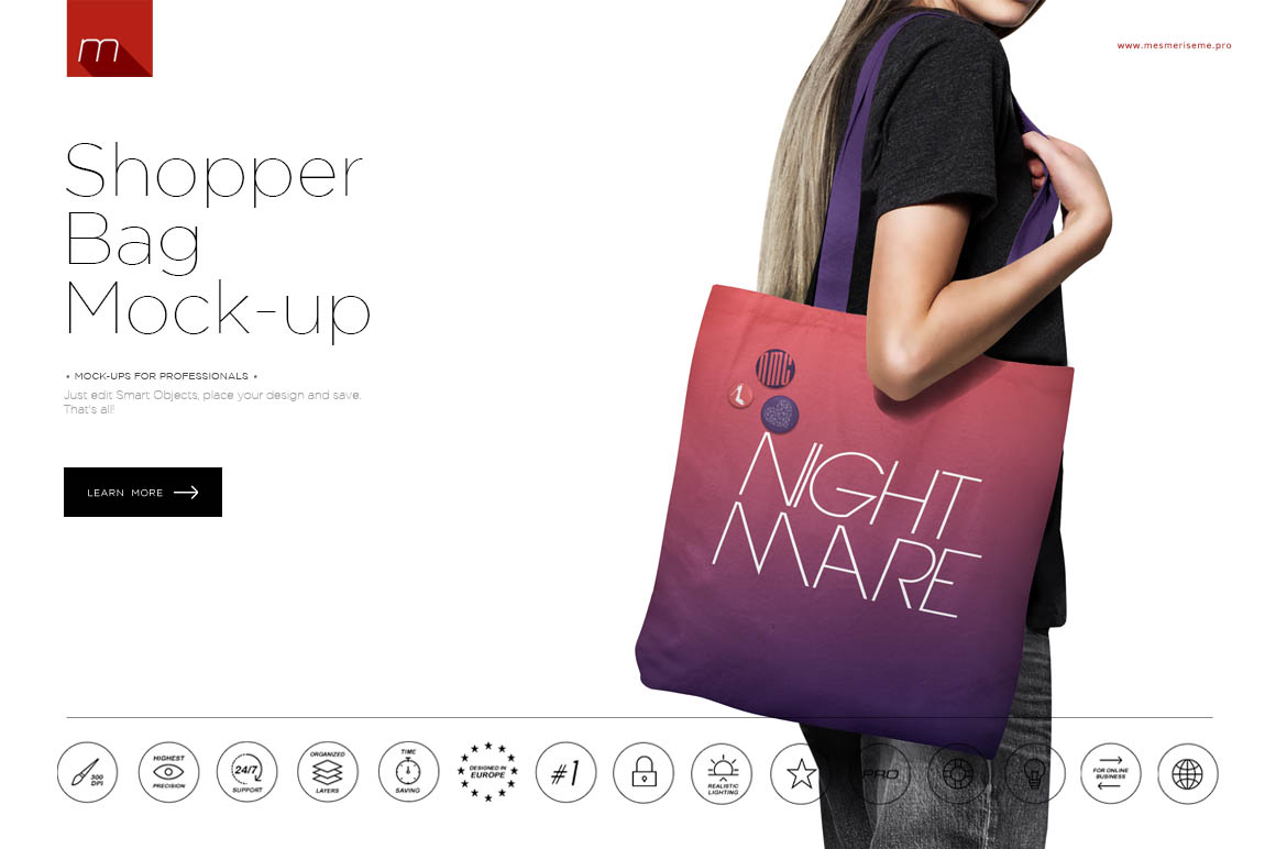 SHOPPER TOTE BAG MOCK-UP: 3 psd files 1400×1400 px 300 dpi; You can change color and gradient of each part of material; You can put your own design using smart objects; You can add plastic badges with your own design; well oganized layers.