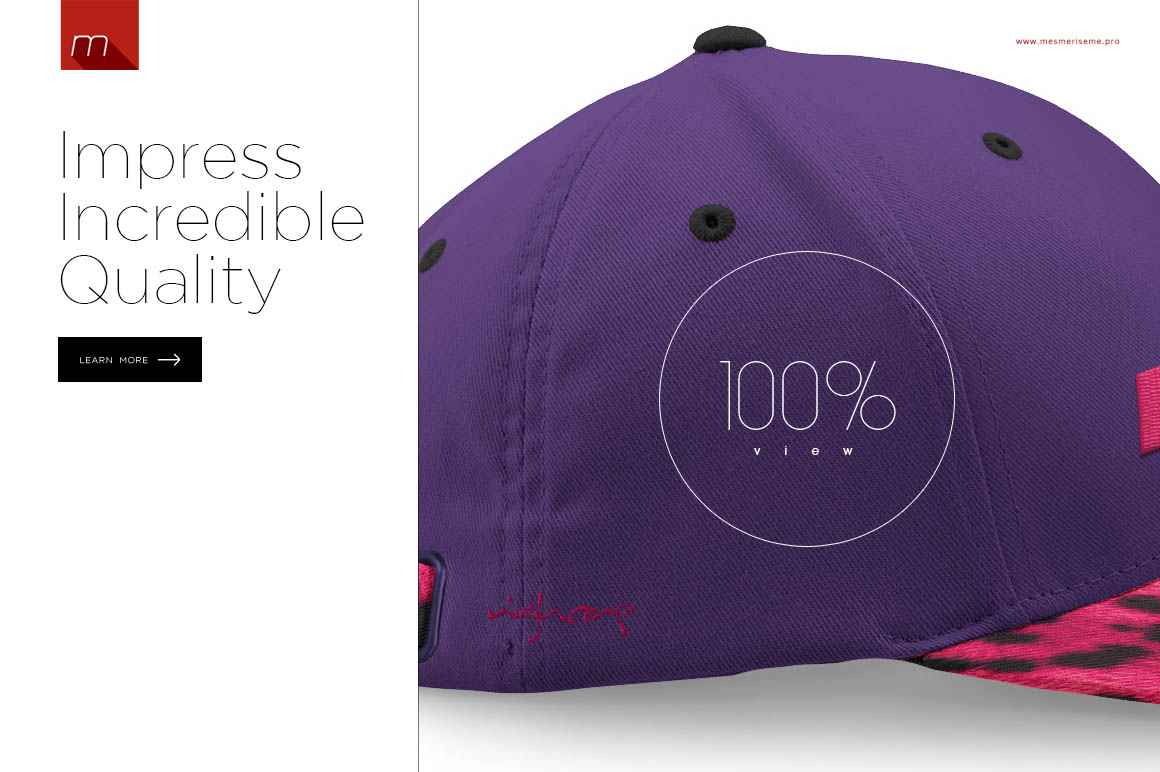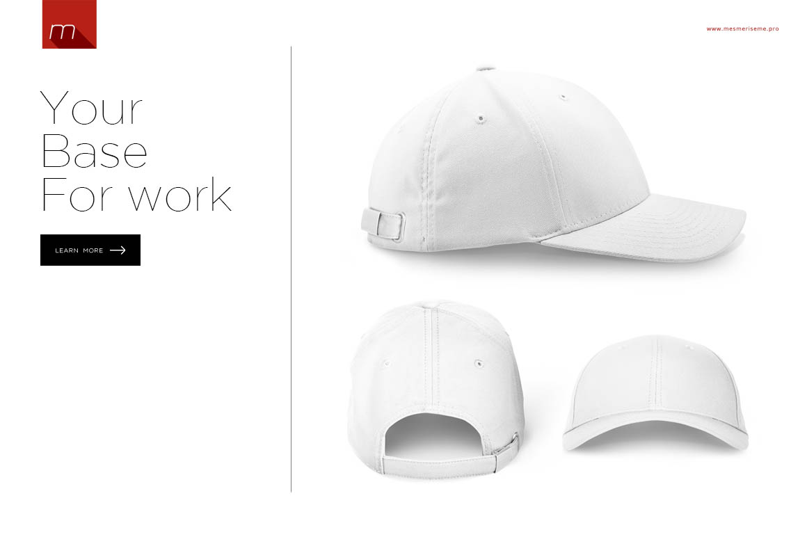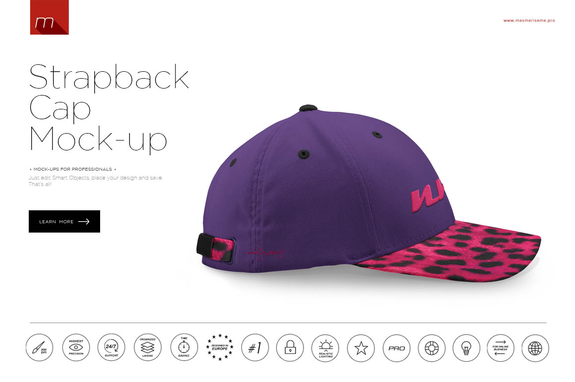 STRAPBACK CAP MOCK-UP: 3 psd files 2000x2000px 300 dpi; Front, back and side view; You can change color and gradient of each part of material; You can put your own design using smart objects; You can add embroyed elements (they are automatically matched with cap perspective so you can change them position); well oganized layers.