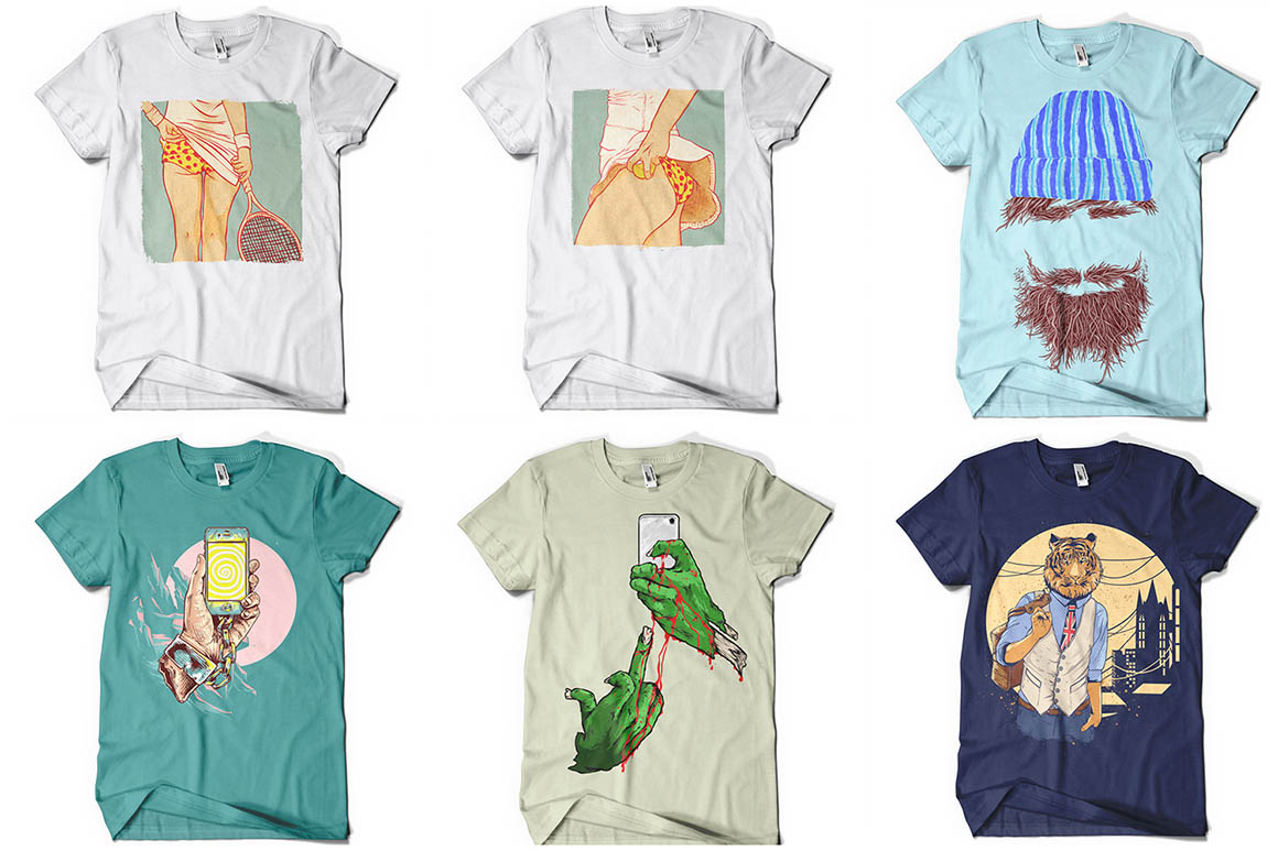 Get your hands on 100 premium T-Shirt Designs in vector format. Scale images up or down to any size you require without losing an ounce of detail. Easily customize any of these designs using the original AI and EPS file formats (NOTE: some files come in PSD format). With just one simple click, change up the colors of your image. Images are perfect to work right onto T-shirts, hoodies or even mugs. Besides apparel, these vectors are perfect for a variety of promotional materials such as flyers, ads, posters and more.