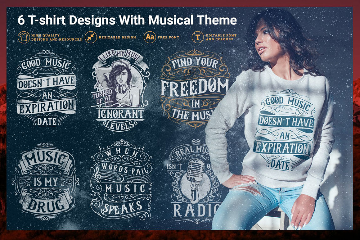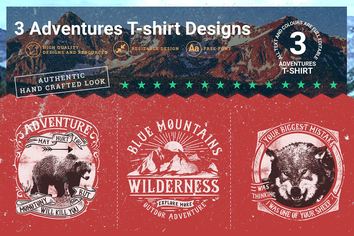 Get your hands on 100 premium T-Shirt Designs in vector format. Scale images up or down to any size you require without losing an ounce of detail. Easily customize any of these designs using the original AI and EPS file formats (NOTE: some files come in PSD format). With just one simple click, change up the colors of your image. Images are perfect to work right onto T-shirts, hoodies or even mugs. Besides apparel, these vectors are perfect for a variety of promotional materials such as flyers, ads, posters and more.