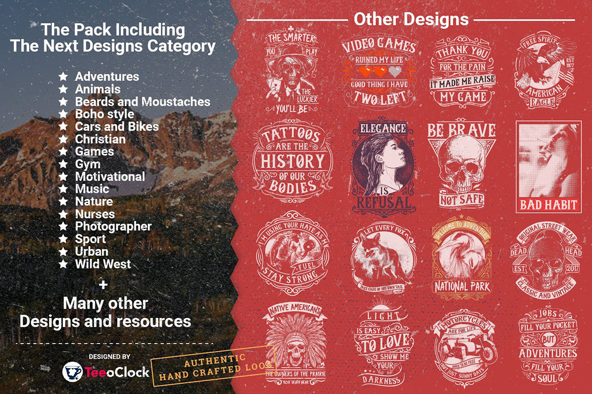 Choose what you’d like and whip up some fabulous T-shirts, hoodies and any other kind of apparel you can think of. If you’re looking to make your own print-on-demand store, this is the perfect opportunity as I prepared these 100 designs that will help you start up your business! All these vector designs from teeoclock.co can help you with new project in a unique way. So be sure to check out the full details and view the preview images because this bundle is really cool 😉