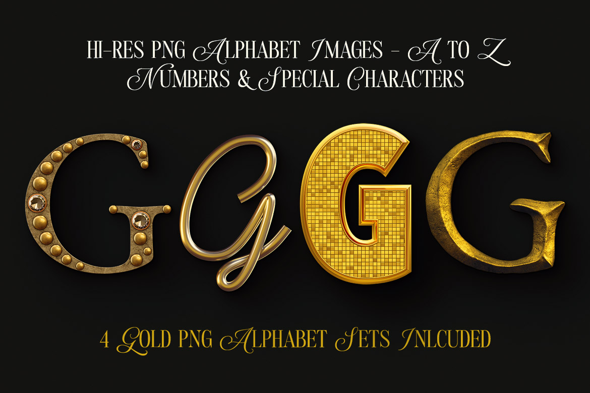 - 4 golden PNG alphabet sets – All letters from A – Z & numbers + special characters (3000 x 3000 pix)